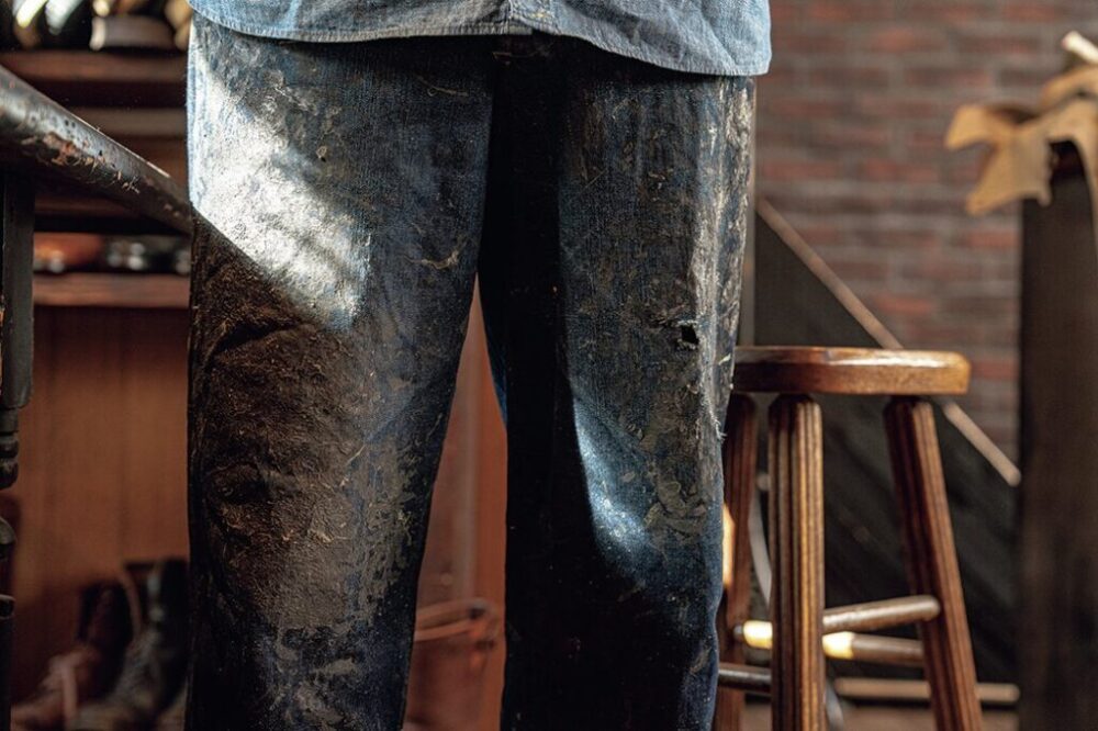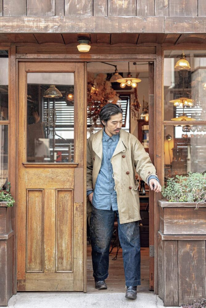 ブーツ作りやリペアの仕事中に着用する作業着の上にヴィンテージコートを重ねたラフなスタイル。シャンブレーシャツやライトオンスデニムはBRASSスタッフの作業着をイメージしたオリジナルで、タフに使い込んで味が出た表情が真骨頂。エイジングが進むほどに風合いを増す、素材選びがリアルワーカーの武骨なユニフォームスタイルを演出。