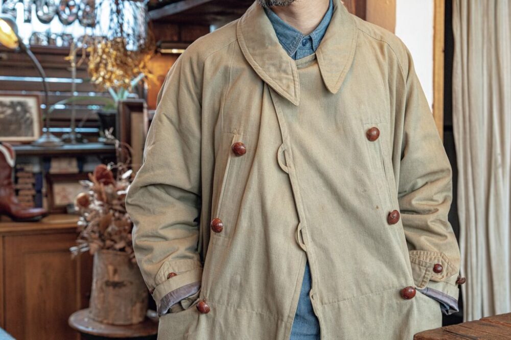 コートはブランド不明のヴィンテージ。フロント8ボタンのデザインを活かして、フロントは開けるか上のボタンだけ留めてラフに着こなすことが多いのだとか。