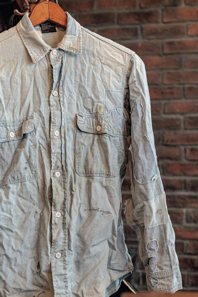 着用しているシャンブレーシャツの同モデルを、作業着として徹底的に着込んだ1枚。多数のリペア跡がカスタムのような顔つきに。