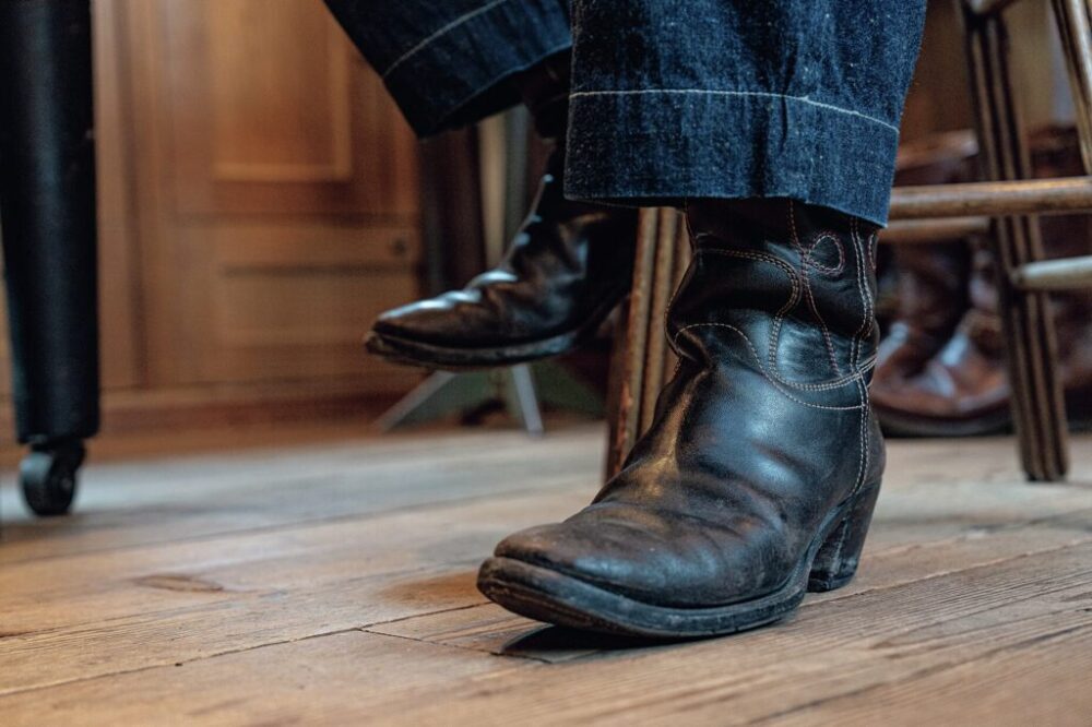 トゥが薄いシャープなフォルムが特徴的なカウボーイブーツはCLINCHの“Cassidy”。クラシカルなフォルムと派手過ぎない刺繍が大人のスタイルを演出。