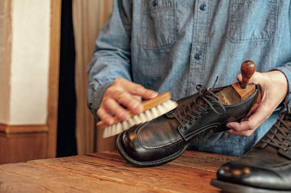 ブラッシングはブーツやレザーシューズのメインテナンスの基本。こちらのモデルはCLINCHのSCOUT SHOES。