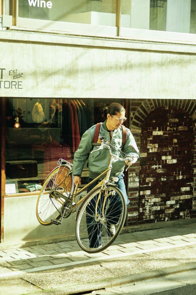 老舗セレクトショップのバイヤー兼ショップマネージャーを務める姫野氏。ヴィンテージフレームの自転車は、毎日の彼の足となっており、機動性を重視したスタイルに寄るのは必然だろう。例えば、着用するL-2Bは着丈が短く動きやすい、シューレースのないブーツはペダルに干渉しない。自然と自転車に乗ることを想定したアイテム選びができているのだ。