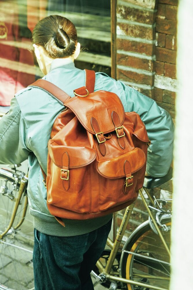 大型のレザーバックパックは染色と特有の加工が特徴のvascoのもの。新品でありながら、すでにヴィンテージを思わせる表情が良し。