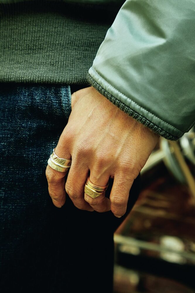 さりげなく着用しているシンプルなデザインのフェザーリングは、Pherrow’sとPeaceのコレボレーションで製作したモデル。