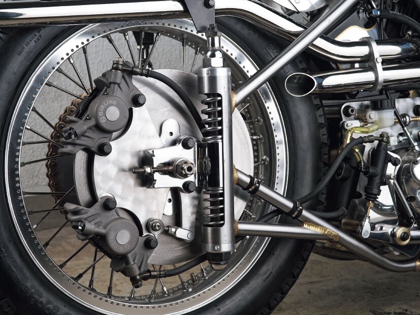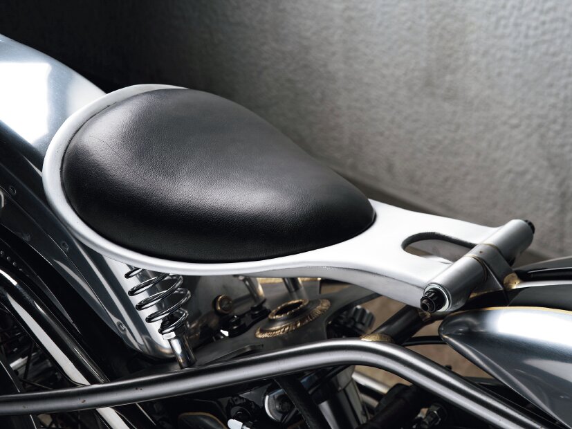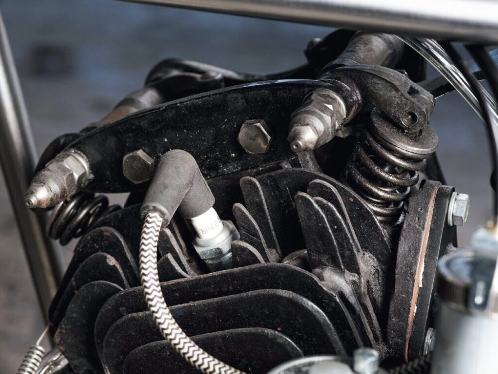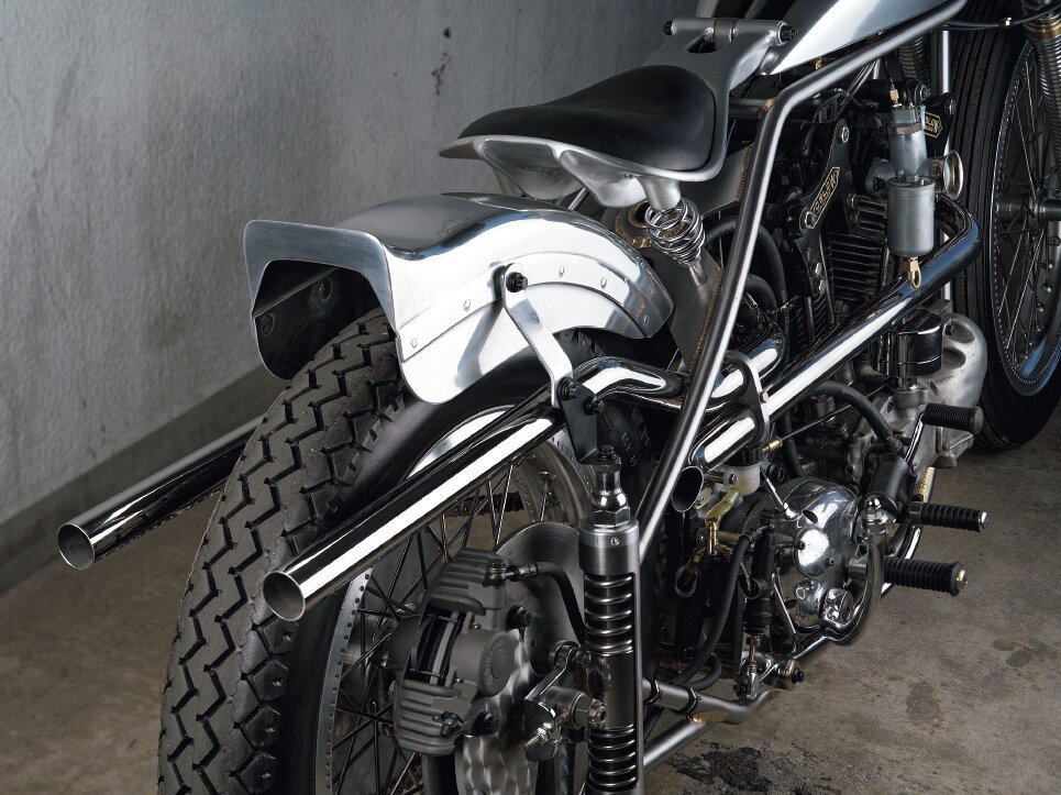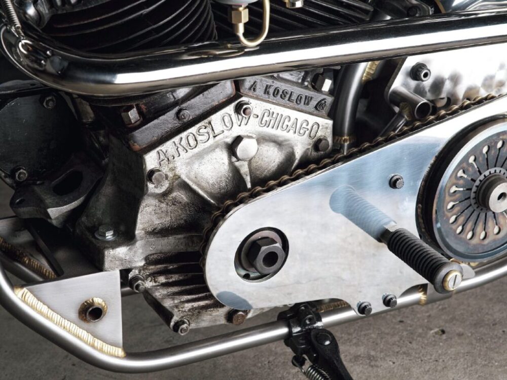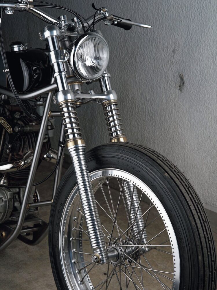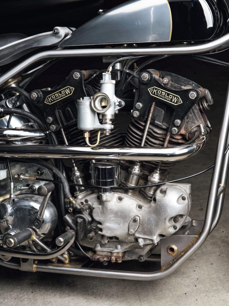 OHV化に加え、半球型(Hemispherical)の燃焼室形状を採用することによって、燃焼効率を向上。バルブが剥き出しになったオープンロッカー仕様や、前後独立のインテイクによって左右にレイアウトされたキャブレター、4本出しエキゾーストも特徴。この車両では、’36年ULをベースにシリンダー/ヘッドをKOSLOW HEADに変更してOHV化し、キャブレターは英国を意識したAMALをチョイス。さらに、ホイールベースを詰めるためにNORTONトランスミッションを採用している。