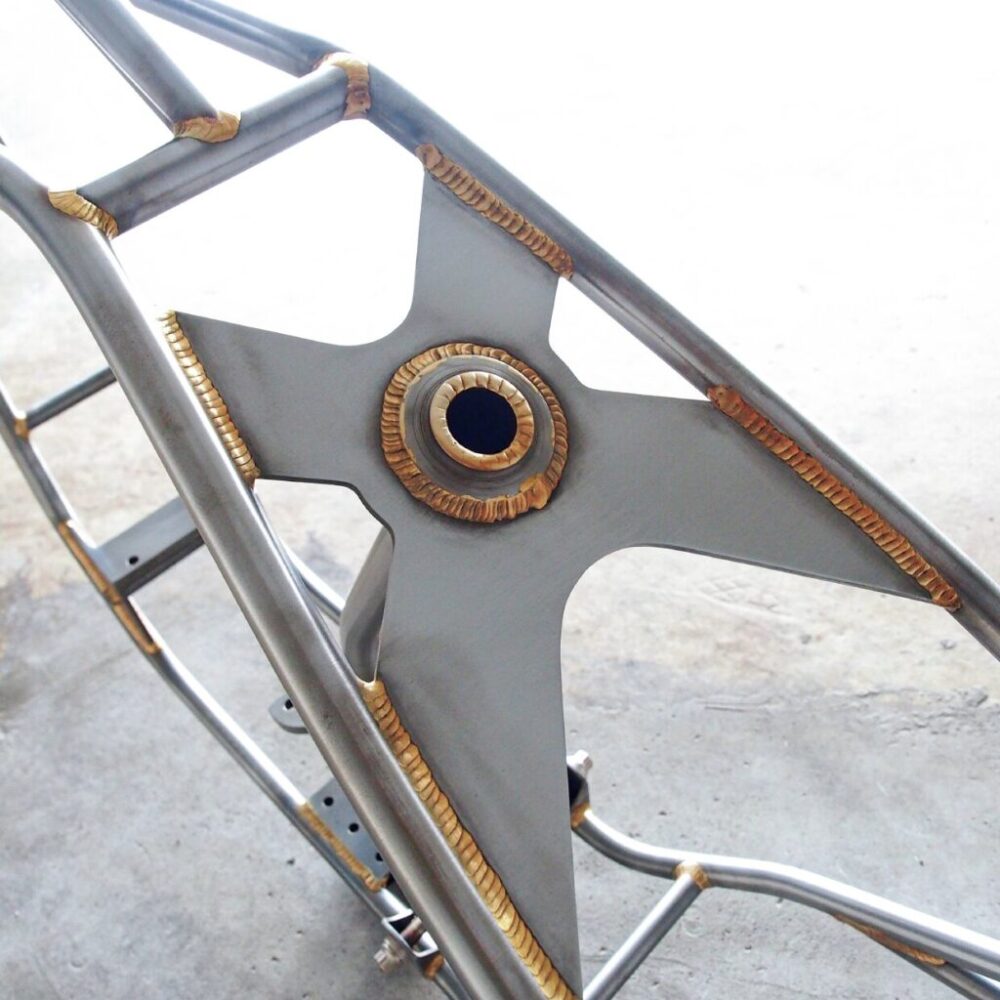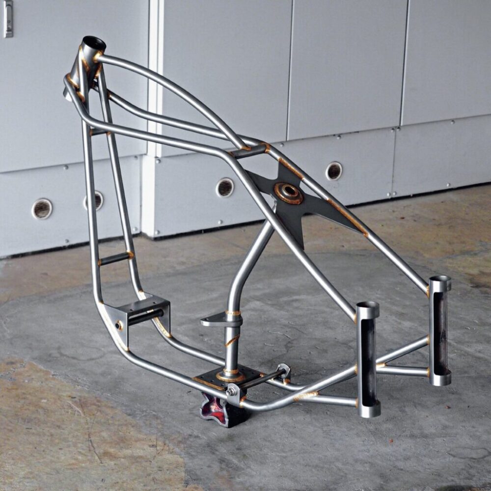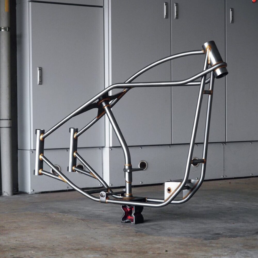 KOSLOWのために製作したワンオフフレーム。プランジャーサスペンション構造や、フェザーベッドフレームをイメージソースとしたネック周りのデザインなど、米英のスタイルをミックスし、全く新しいデザインが生み出されている。エンジンマウント位置を低く、ULに対してホイールベースを詰めたコンパクトなディメンションに設計されているのも見所だ。