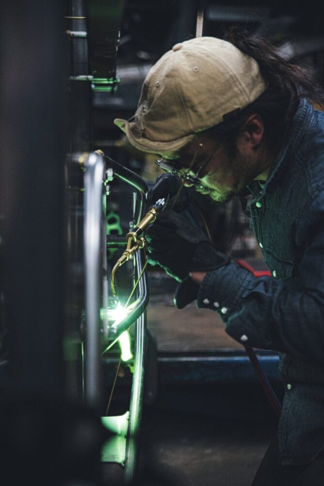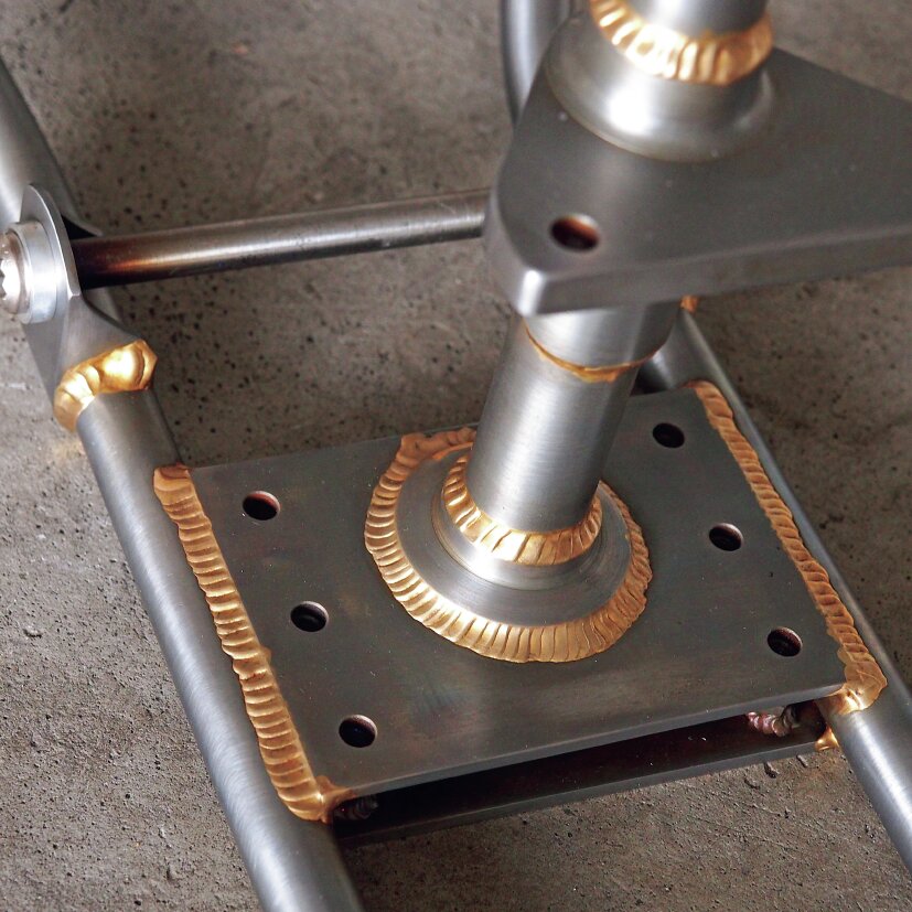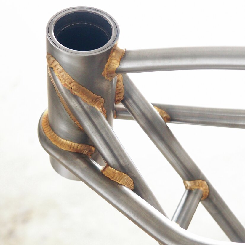 ブロンズブレイジングは低温で処理できるためクロモリ鋼の接合に適した技術なのである。現在はイギリスでも技術者が絶滅に近い状態だが、大沢氏は当時の写真や資料をヒントに約5年かけて独学でブロンズブレイジングを習得した。美しいゴールドのビード跡がデザインと機能美を兼ね備える。
