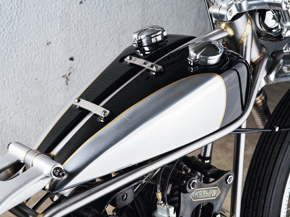アメリカンレーシングの進化の過程で生まれたOHVコンバージョンヘッドを搭載するKOSLOWエンジンや、フレームワークに見られる特殊なロウ付けの技法であるブロンズブレイジングなど、歴史の片鱗を物語る貴重なディテールワークを備える一方で、「○○年代のチョッパーっぽい」といったような知識に基づくカテゴリーづけが不可能な、全く新しいカスタムバイクである。