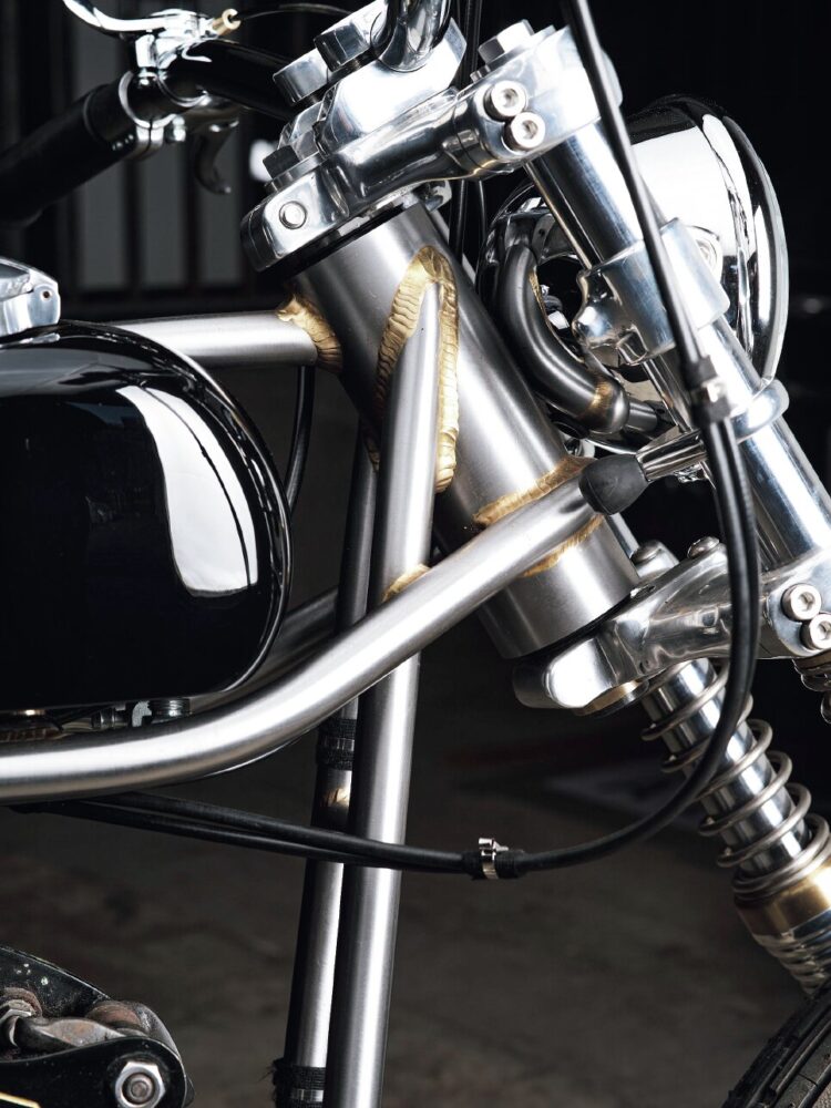 外装はもちろん、フレームを0から製作するということはシルエットの軸となる部分から無限の可能性を秘めているということ。それぞれのディテールにおいて、ヴィンテージバイク、カスタムに造詣の深い両者がディスカッションを重ね、緻密な作業の基に生み出された1台である。