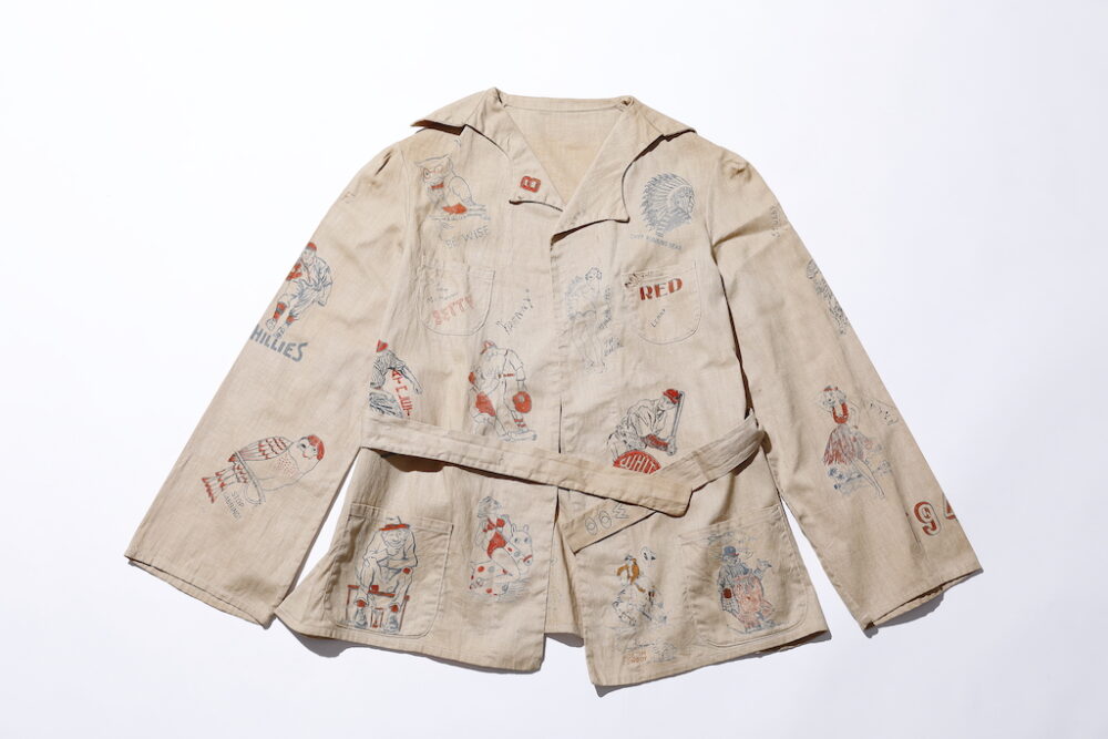 サイズ感やコンディション、それに実用性などよりも、全面に様々なイラストがプリントされているデザインだけで手に入れた。フロントにはボタンも存在せず、ウエストベルトだけで着用するという仕様で、襟も変形デザイン。いったい何のためのジャケットなのかは不明。だた、ひとつひとつのプリントを眺めながらそのすばらしさを実感している。