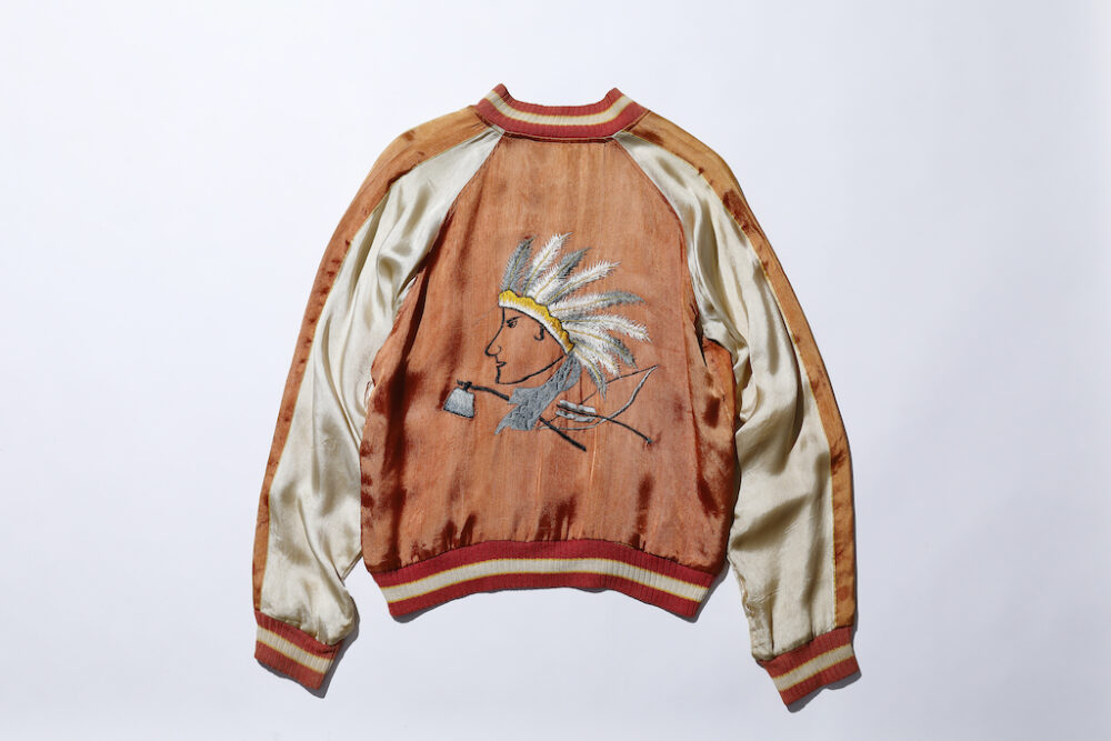 レーヨン100%でリバーシブル仕様になっていないという1枚仕立てのスカジャン。2~3年前に古着のファティーグパンツに合わせてよく着ていたモノで、何と言っても鮮やかな色味がすばらしい。デザインは胸には刺しゅうは無く、背中にネイティブアメリカンの顔が入るのみという変わり種。「最終的にどうしたかったの?」という下手ウマな絵柄もお気に入り。年代は不明だが、1950年代以前のジャケットではないかと。