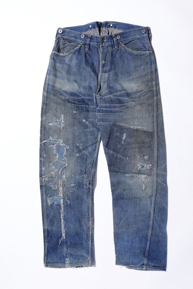 当時、建物の断熱材代わりに壁のなかに敷き詰められていて、解体時にボロボロの状態で発掘されたというワークパンツ。札幌の古着店Pale Faceで見つけ、それを盟友ジップ・スティーブンソンに頼んでハンドステッチでリペアしてもらった。戦前の衣類に見られたすべて本縫い(一本針)による縫製で、今のスティーブンソン・オーバーオールの定番デニムのヒントになった1本。