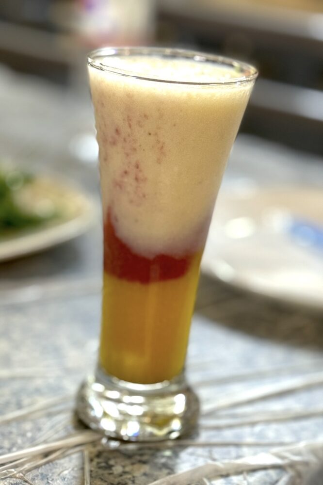 美しい層を成すフルーツカクテル。下からマンゴー、ストロベリー、バナナの層になってます。クウェートはお酒が禁止されているので、基本的にはお酒は飲めません。