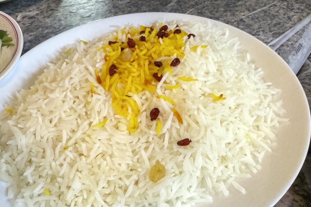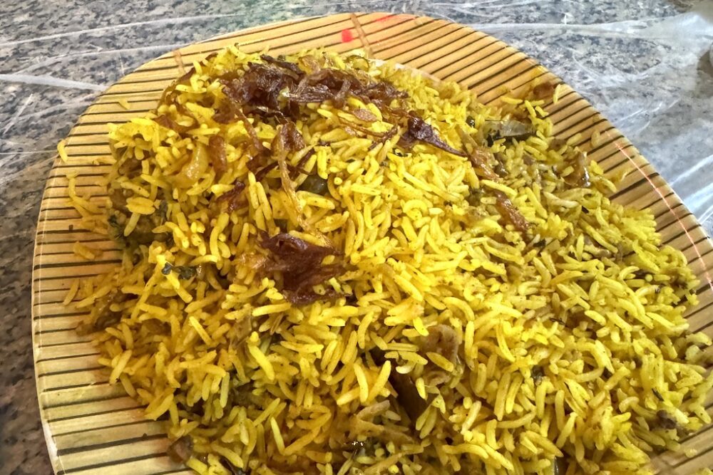 チキンビリヤニと呼ばれるライス。日本で言う炊き込みご飯の中東バージョンですね。 このパサパサのご飯が逆にカレーと相性が良いんですよね。