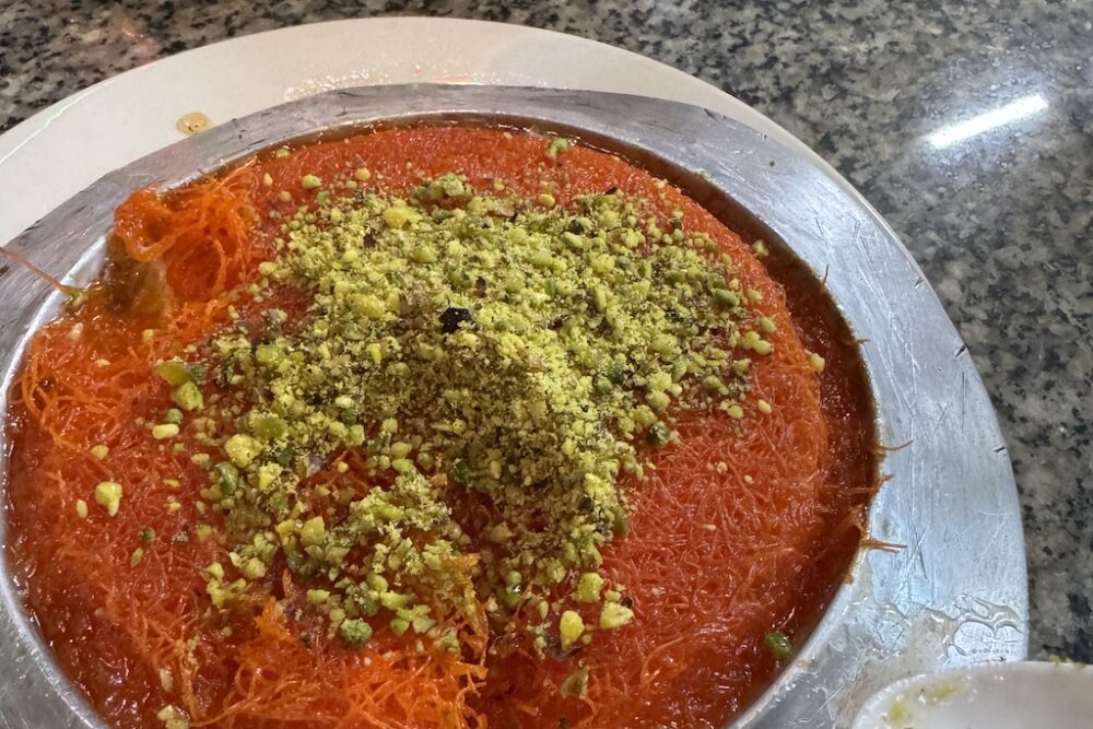 クナーファ、ひと口サイズの中東の伝統的な菓子です。シロップに浸した細い麺状のペストリー(小麦粉と水で作ったサクサクとした糸状生地)に、砕いたピスタチオをアクセントとしてトッピングしています。その色味が鮮烈、甘さも強烈。