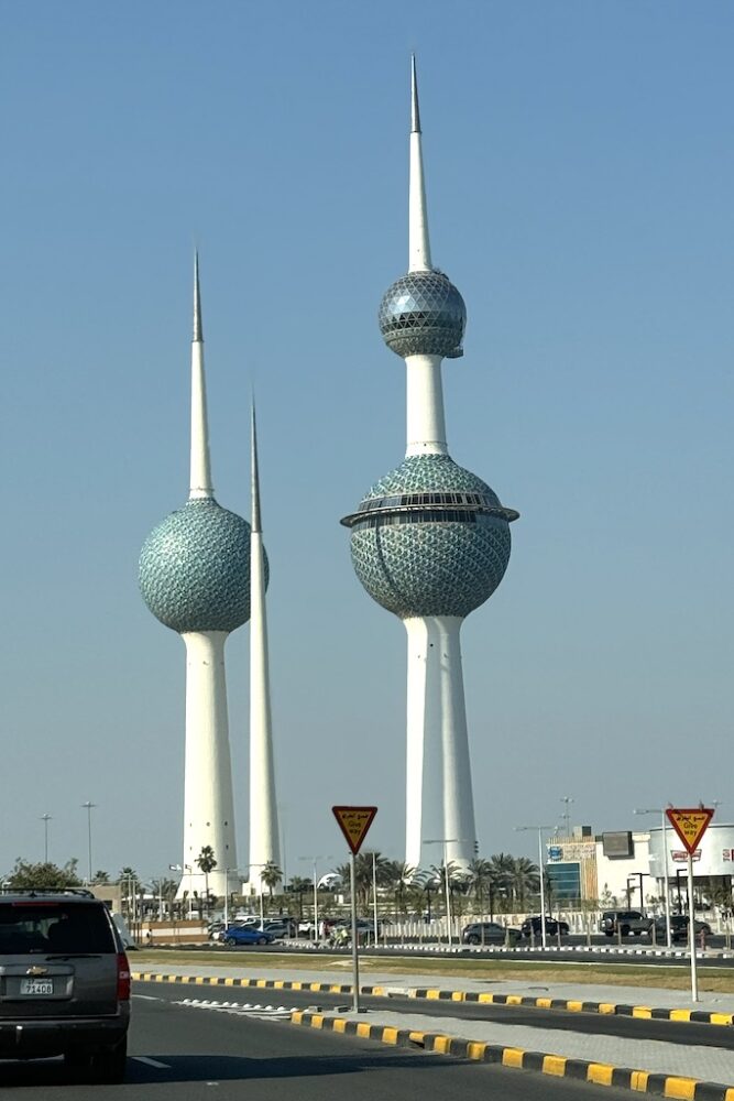 クウェートシティにある象徴的なクウェートタワー。青空の下でそびえ立つ3つの細い塔。この塔が建てられたのは、石油マネーに沸く戦後のことだったようです。
