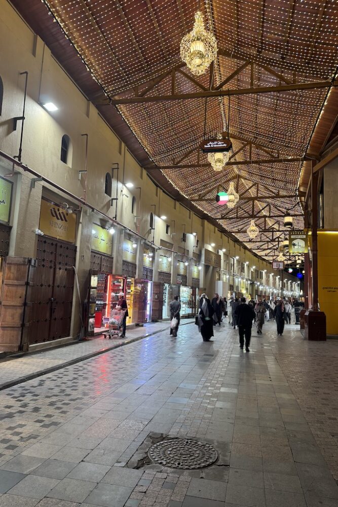 Souq Mubarkiyaの内観はこんな感じ。マーケットの外観だけでなく、天井に無数の電飾があることでキラキラとしております。電気代は気にしないお国柄なのかもしれません。