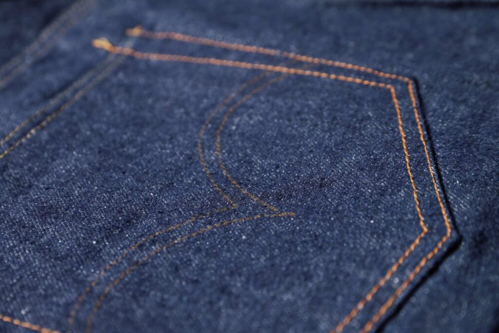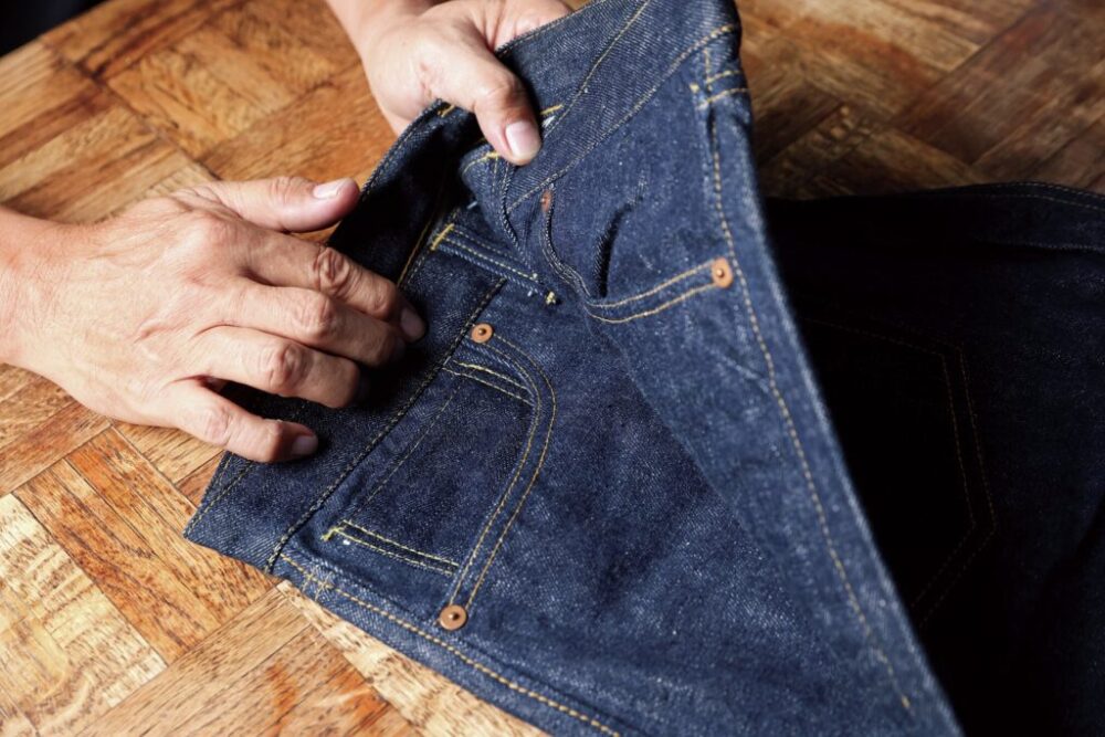 「30年くらい前に知り合いの古着店から、店閉めるから買うてくれへんか? 言われて買うたんがこのジーパンや。3本あって、デッドストックはこの1本だけ。もう1本ワンウォッシュくらいのジーパンと2本買うたんやけど、どうせなら3本とも買うとけば良かったなって、後々になって思うたんやけど、もう遅いわな。このデッドストックは、さすがに穿かれへんからな。最低限、日焼けしないように、湿気を吸わないように考えて大事にしまっておいたわ。穿かないにしろ、これまでこさえてきたジーパンのディテールのサンプリングとしてちょくちょく活躍してくれましたわ。大戦モデル特有のペンキステッチとかな(笑)」