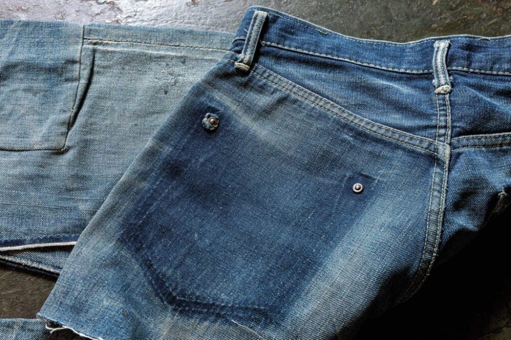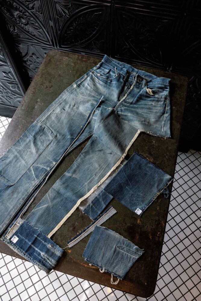 そんな彼の「とっておきのヴィンテージ」はLEVI’S S501XX。自身でブランドを始めるきっかけにもなった大戦モデルだが、見せてもらったのは、あろうことかハサミを入れ、切り刻んだジーンズ。