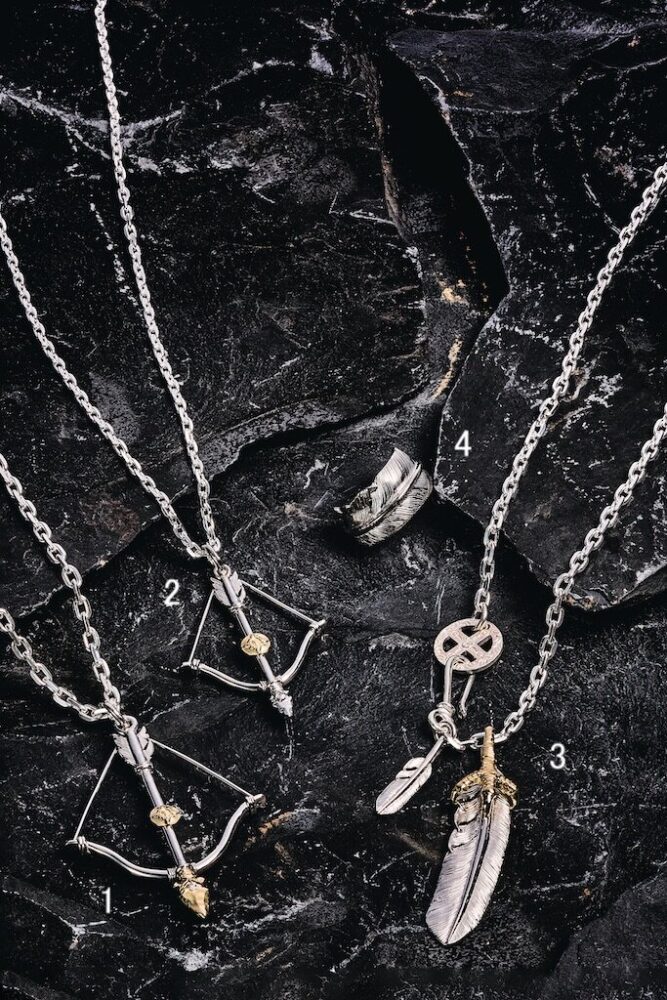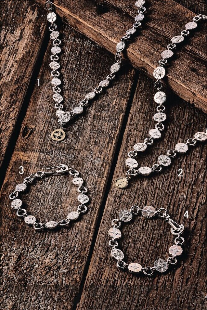 新作の「メディスンマーク& FAメタル」は、全ての起源である太陽をモチーフにしたFIRST ARROW’sのブランドロゴと、ネイティブアメリカンの間では自然や人の一生のサイクルを表し、お守りとされるメディスンホイールのメタルを使った作品。チェーンは好みのペンダントヘッドと組み合わせればオリジナル作品も楽しめる。