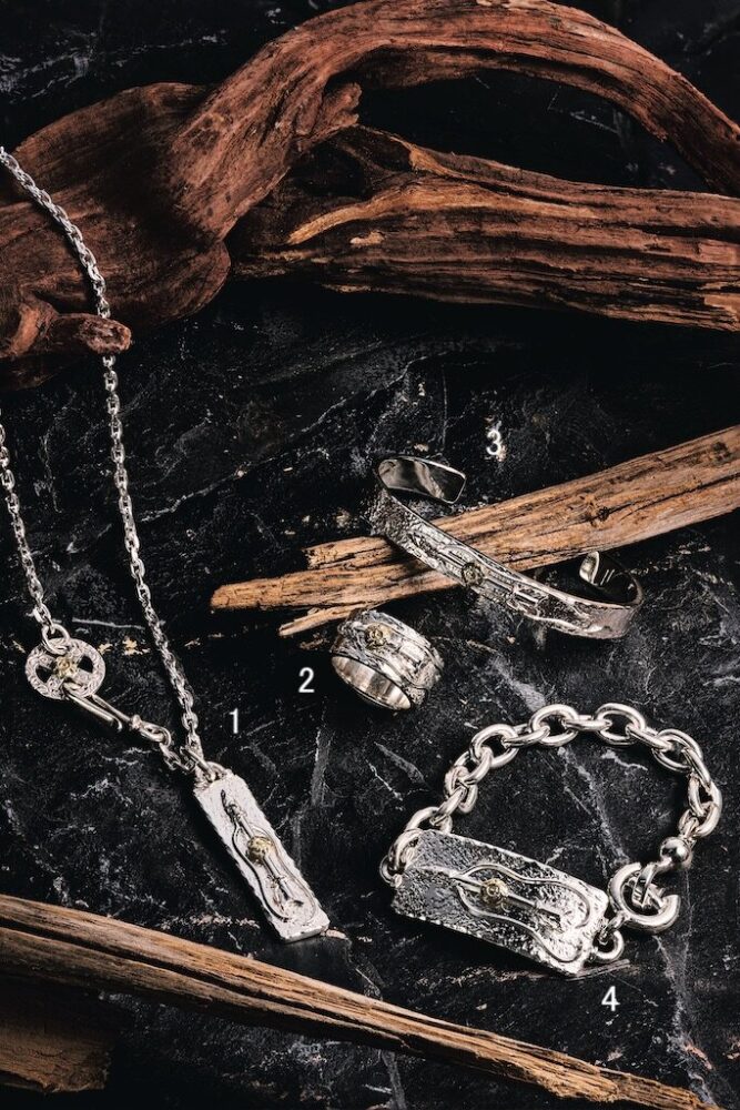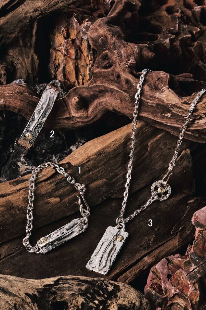 2024年秋冬の新作として発表されたベアロックシリーズの「フェザー ベアロック」。荒々しいベアロックを表現したプレートにあしらわれるのは、定番ながらファーストアローと同じく躍動感を与える装飾が加わったフェザー。ネイティブ系では定番となるモチーフを組み合わせつつオリジナルな作品へと昇華させている。