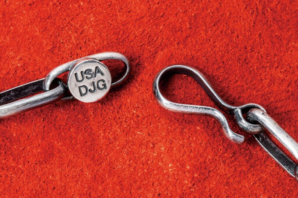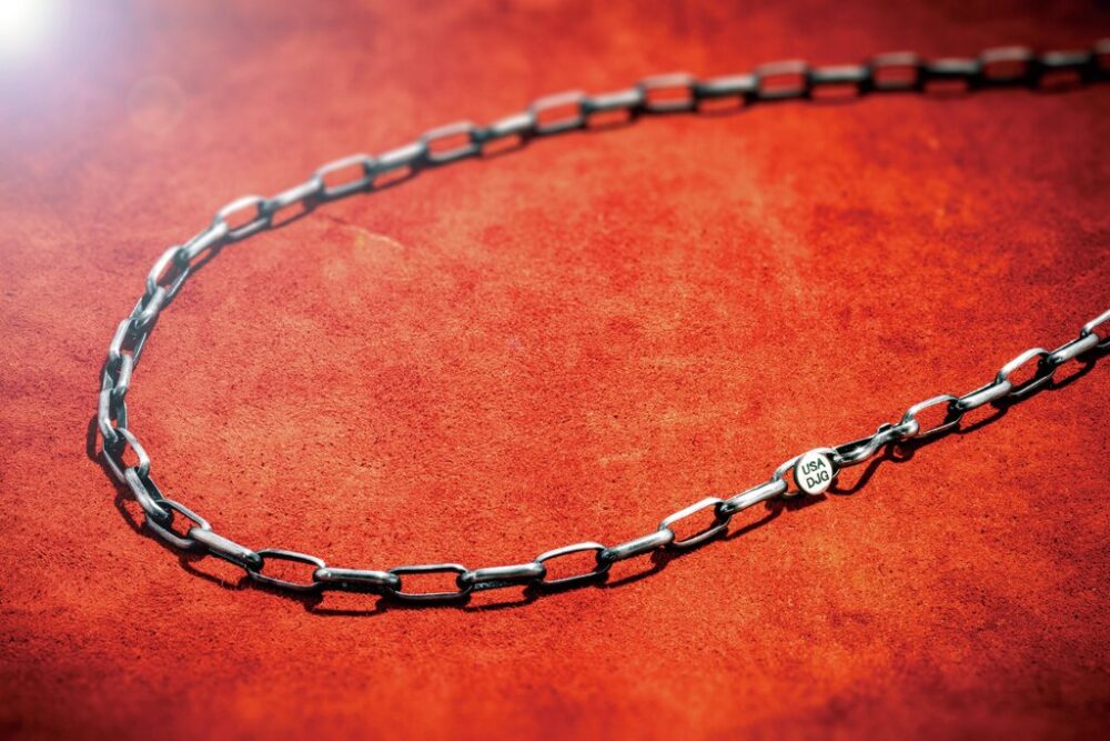 ナバホチェーンと呼ばれる伝統的な工芸品を、フォルムや駒サイズから再設計し、ネイティブアメリカンの完全手仕事で再構築したスペシャル仕様。シルバースミスが銀線をひとつずつ手で曲げ、成形するため強い強度を誇る。60㎝¥82,500_、70㎝¥99,000_