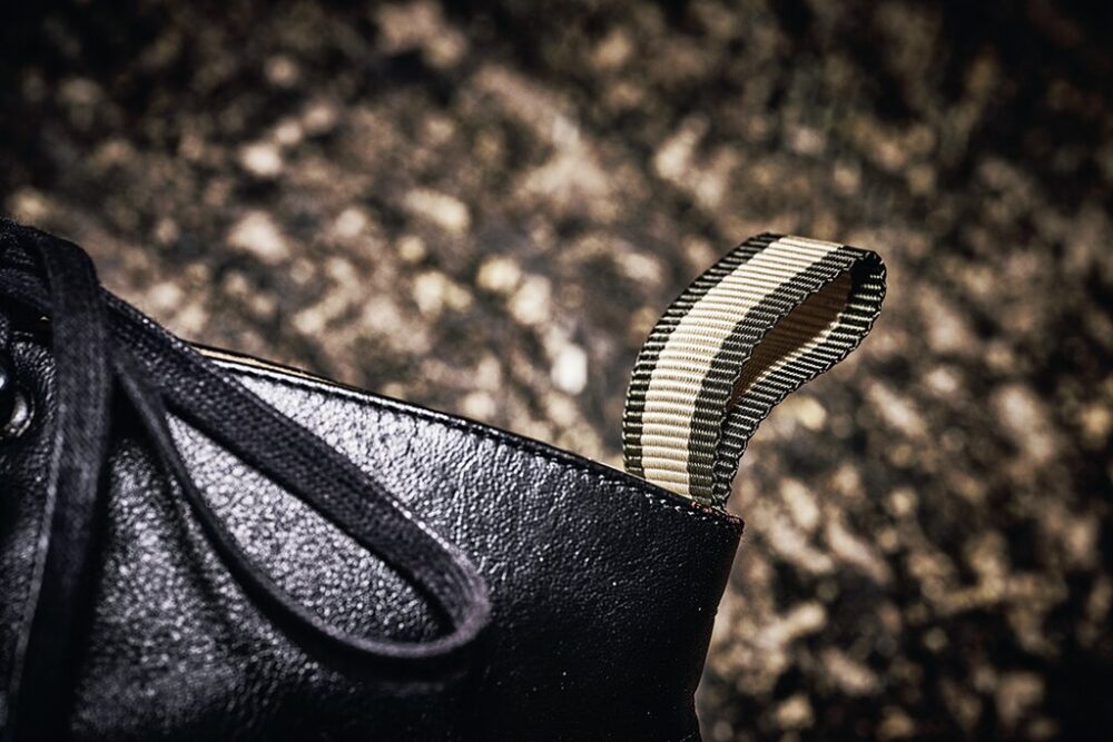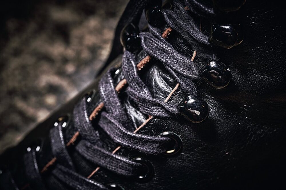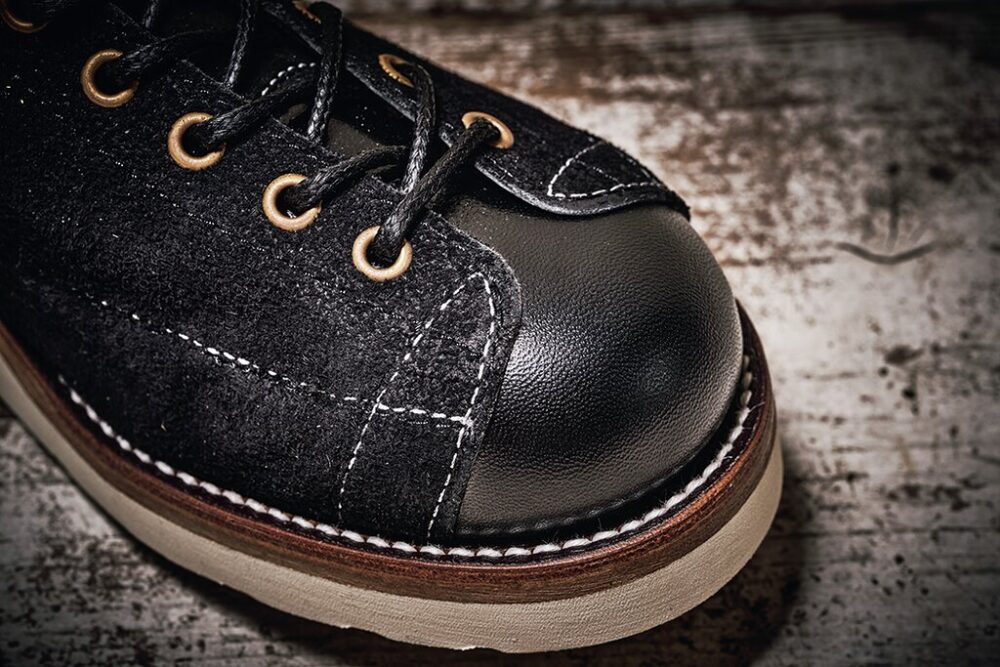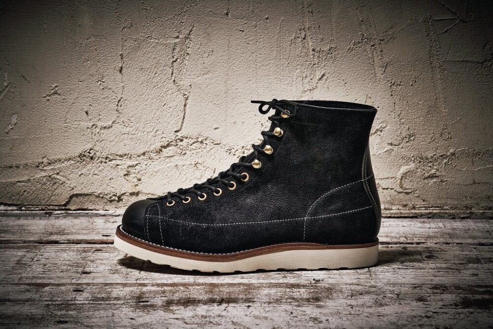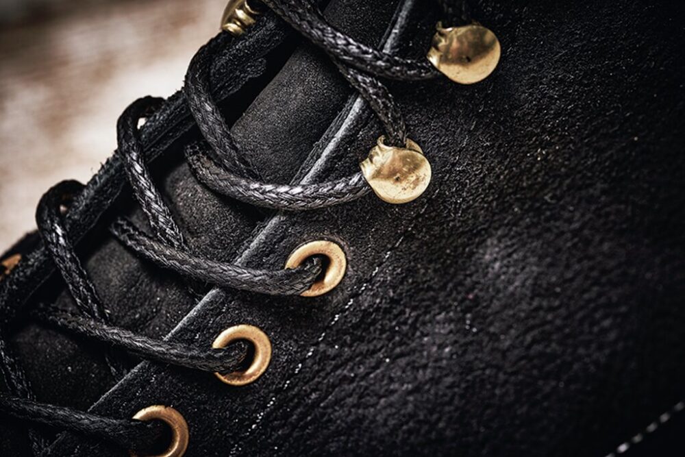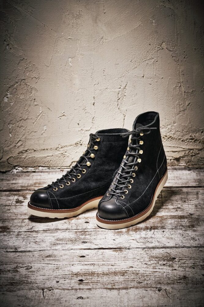 アッパーのマテリアルに牛革のラフアウトレザーを採用したテンマイルブーツ。トゥボックスまで外羽根が伸びるいわゆるモンキーブーツと呼ばれるデザインで、足首から足の甲にかけてシューレースでフィッティングを調整できることが大きな特徴。ワークブーツの堅牢な作りでありながらも、きめ細かなブラックのラフアウトレザーにゴールドの真鍮製シューホール&フックが上品で上質なものであることを印象付けてくれる。また見た目以上に軽量で、革馴染みが良い素上げによるカウハイドを使用しており、履き初めから軽快に着用できる。