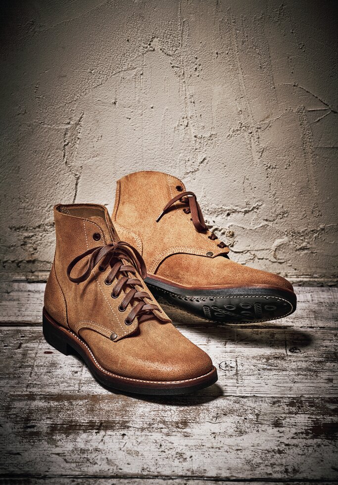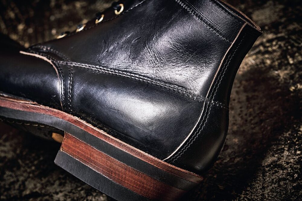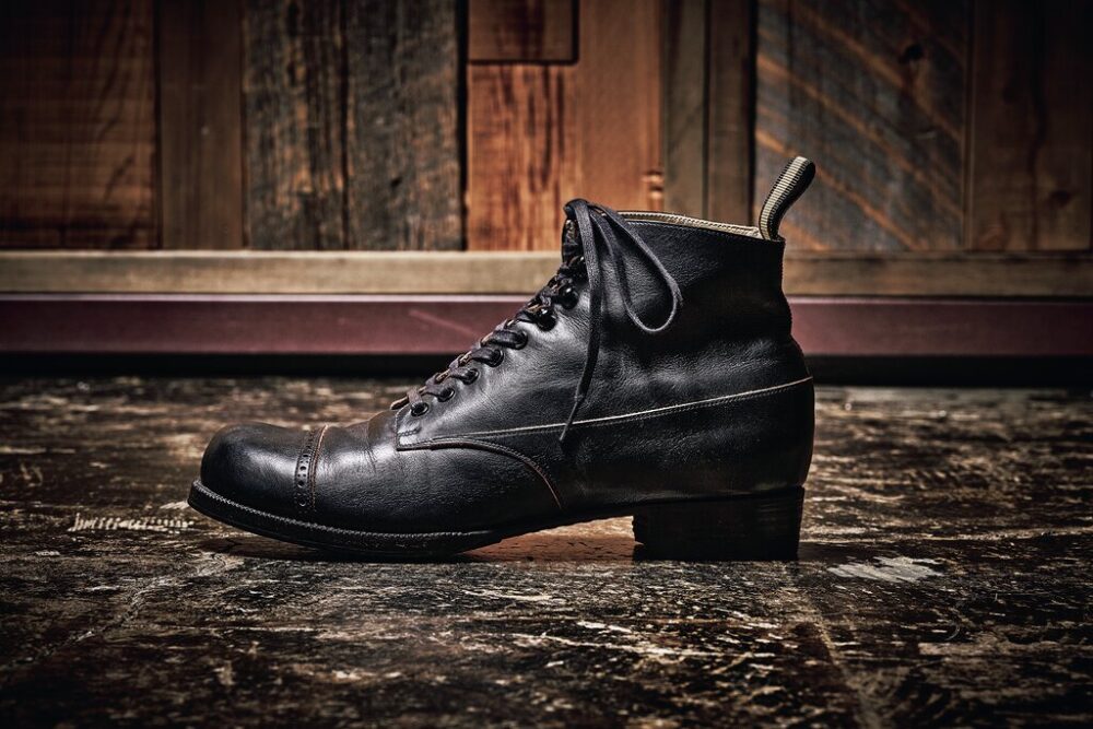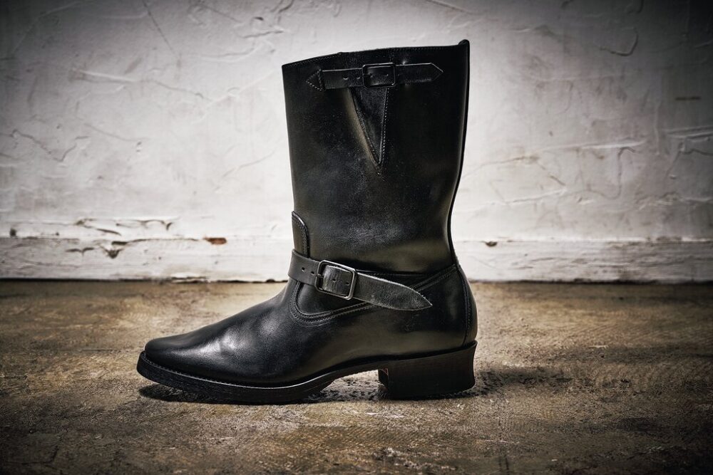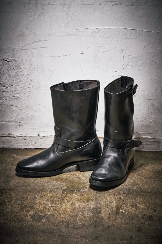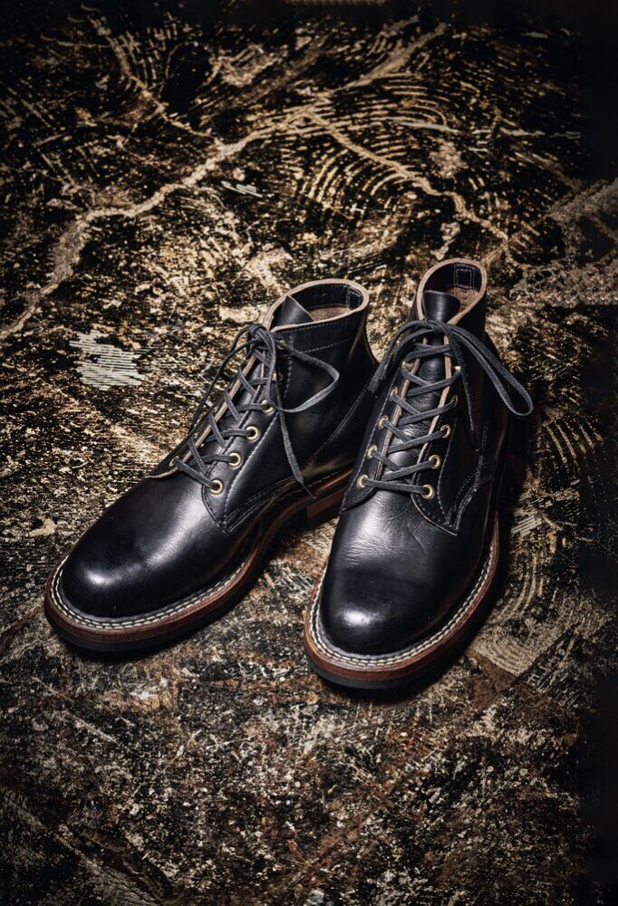 1910年前後のアメリカ、フランスのブーツに着想を得たハイトゥ、ブルドッグトゥなどと呼ばれるラインが入った特徴のあるつま先と、アッパー上下に別パーツを縫い合わせた腰革デザインが特徴のキャップドトゥの外羽根ブーツ。2種類の製法を組み合わせてウエストを強く絞り、当時のクラシカルで優美なフォルムを再現した。マテリアルには、きめ細かく滑らかながら、自然な肌を残した馬革を採用しているため、柔らかく足馴染みも良いのは言うまでもなく、履くうちにトラ・バラ傷などが浮き出てくることも馬革らしい特徴だ。
