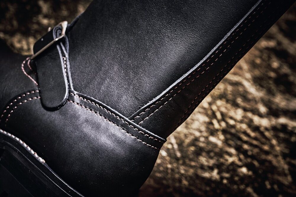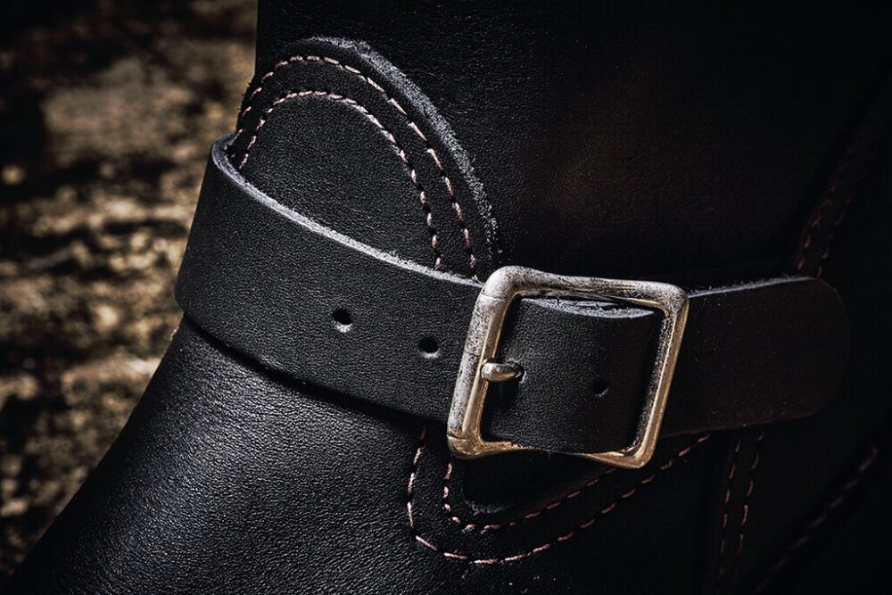 BILTBUCKの定番モデル「The Pioneer」。モーターサイクルブーツの創生期をコンセプトにハイグレードマテリアルで作り上げたドレッシーでクラシカルなフォルムがこのモデルの大きな特徴となっている。マテリアルにはバットレザーでは最高グレードのひとつに数えられるイタリア・グィディ社製ホースバットを採用。ミッドソールは馴染みが良く耐久性に優れた最高級オークバーク・ベンズに、アウトソールはビルトバックオリジナルセパレートソールを装備。ブラックの焼付け塗装を施したサンドキャストのアイアンバックルも印象的だ。