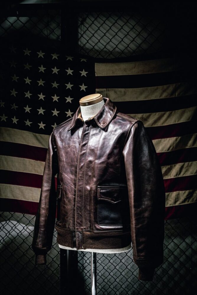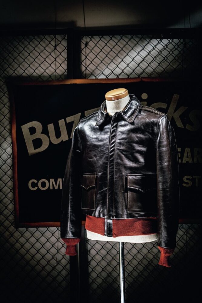 米陸軍航空隊が採用するA-2を製造したコントラクターの中で最多の7度もの納入を誇ったエアロレザー社。その中で1941年に製造した5度目の生産ロットに当たる“赤リブ”モデルが登場。4度目までの納入分では台襟が付いた仕様であったが、この5度目からは台襟を省略した仕様へと変更されたのが特徴で、このモデルは左右の前見頃が同じ型紙を使用しているため、ポケット位置を水平に移動して正面から見た時のバランスを保っている。