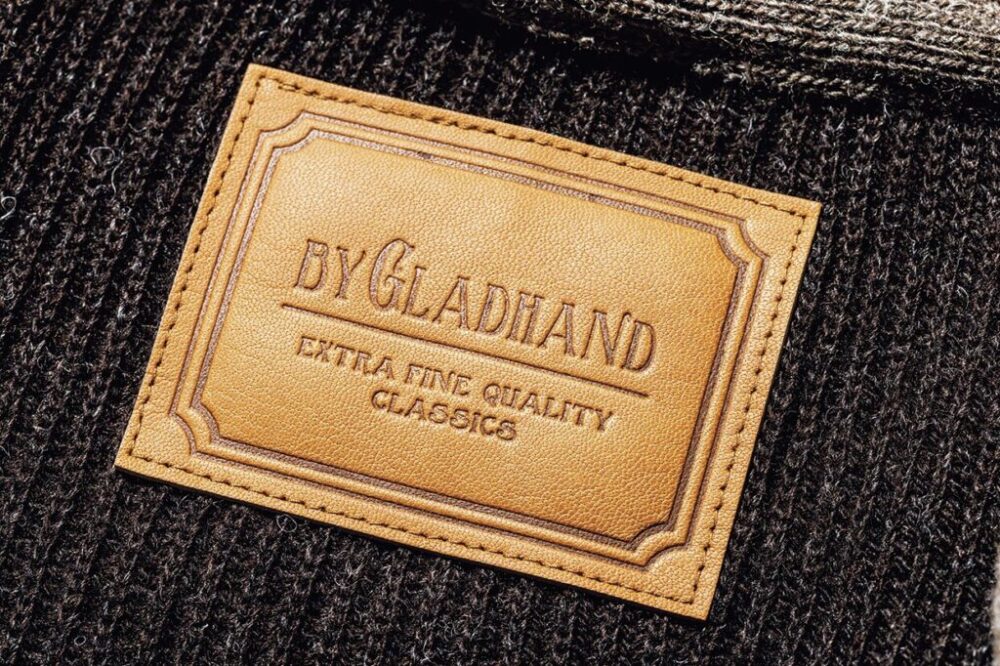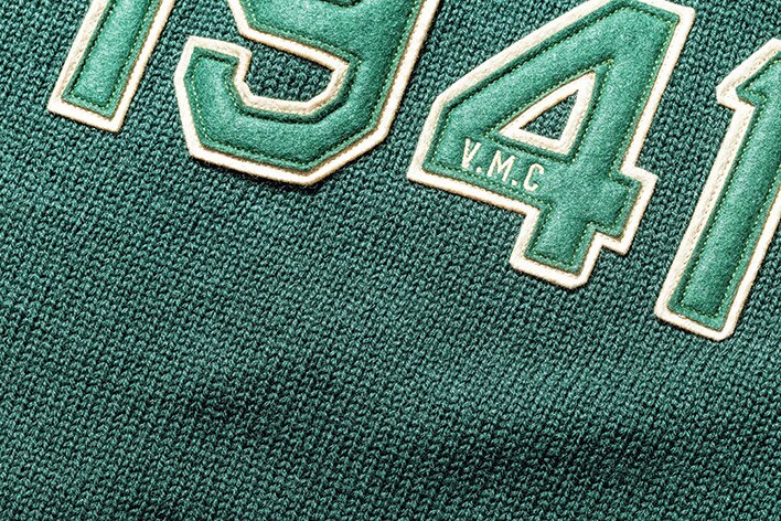 和歌山の島精機製作所にて完全無縫製型横編機で編み立てたホールガーメントニット。フロントのフェルトシニールワッペンや袖口と裾のリブを折り曲げて使用するクラシカルな仕様。
