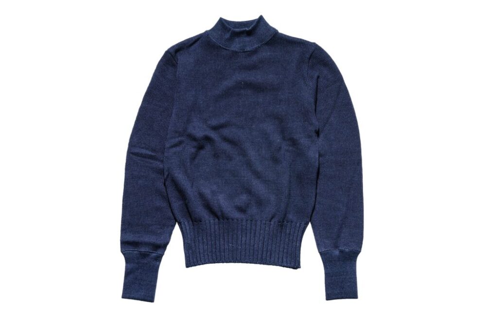 1960年代のUSNデッキセーターをベースにデザインされたインディゴセーター。伝統的な海軍スタイルであるハイネックや折り畳み可能な長いリブ編みニットカフスが印象的。