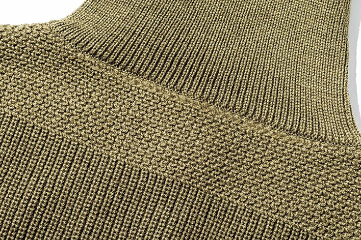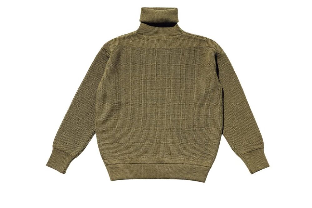 1930年代に米陸軍が採用したタートルネックセーターを再現。リブ使いや前身頃と後身頃は縦の編み目に対し、運動量と負荷の掛かりやすい肩と裾は横の編み目にするなど計算されている。