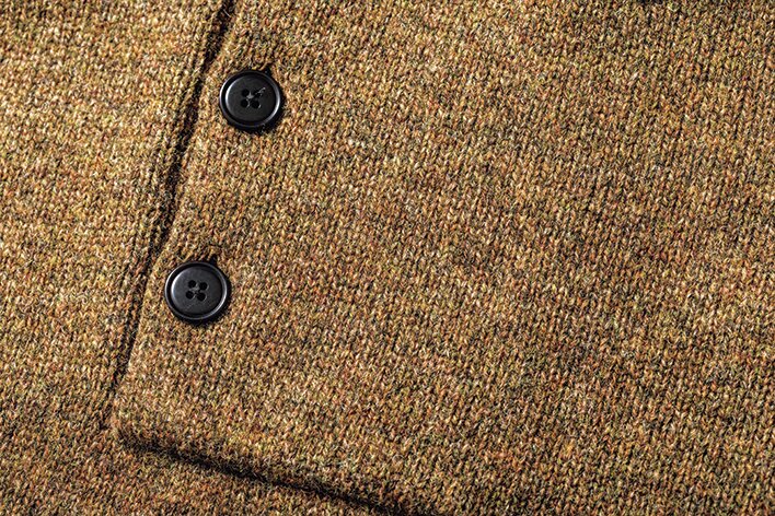 1910年代のショールカラーニットをモチーフにシェットランドウールを天竺編みで編み上げたセーター。クラシカルなデザインで、フロントボタンにはナットボタンを使用している。
