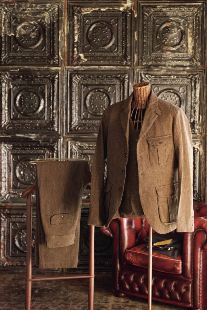 かつて、ヨーロッパの紳士がハンティングなどの時に着用していたようなクラシックスタイルの3ピース。ジャケットのプリーツ付きパッチポケットやラペル一体型のチンストラップがそれを物語っている。100%ウールの上質かつ、カジュアルなドレススタイル。