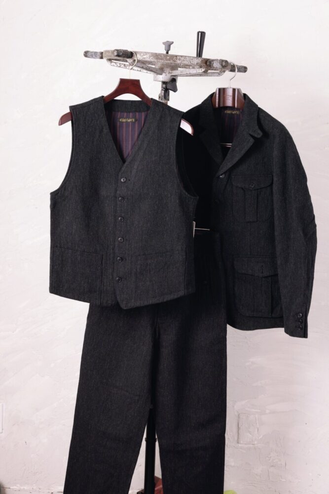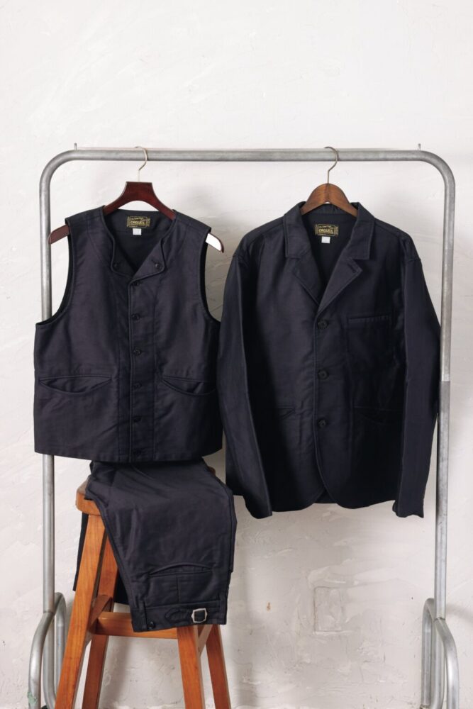 ヴィンテージのフレンチワークスタイルでは定番的な素材である厚手のモールスキンを使用した3ピース。いにしえのワークウエアを再現している。こちらもジャケット、ジレ、トラウザーズとそれぞれの個性が際立っており、単品で他の服に合わせても存在感を放つ。カラーはブラックのみ。