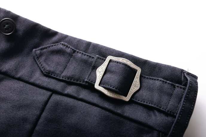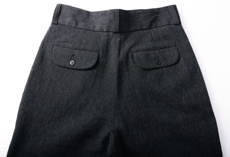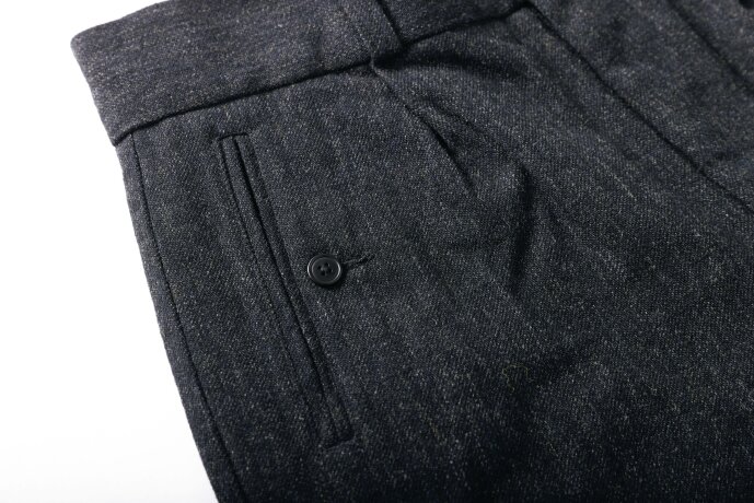ジャケットのみならず、トラウザーズのフロントにあるスラッシュポケットまでボタン留め仕様に。
