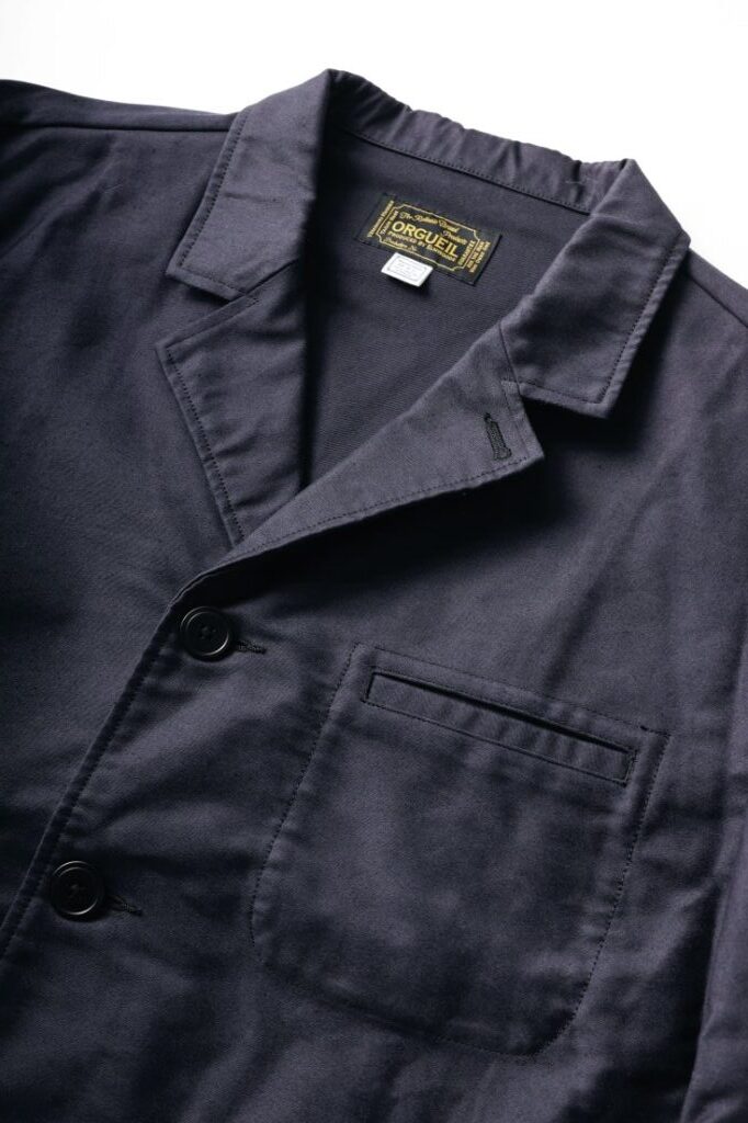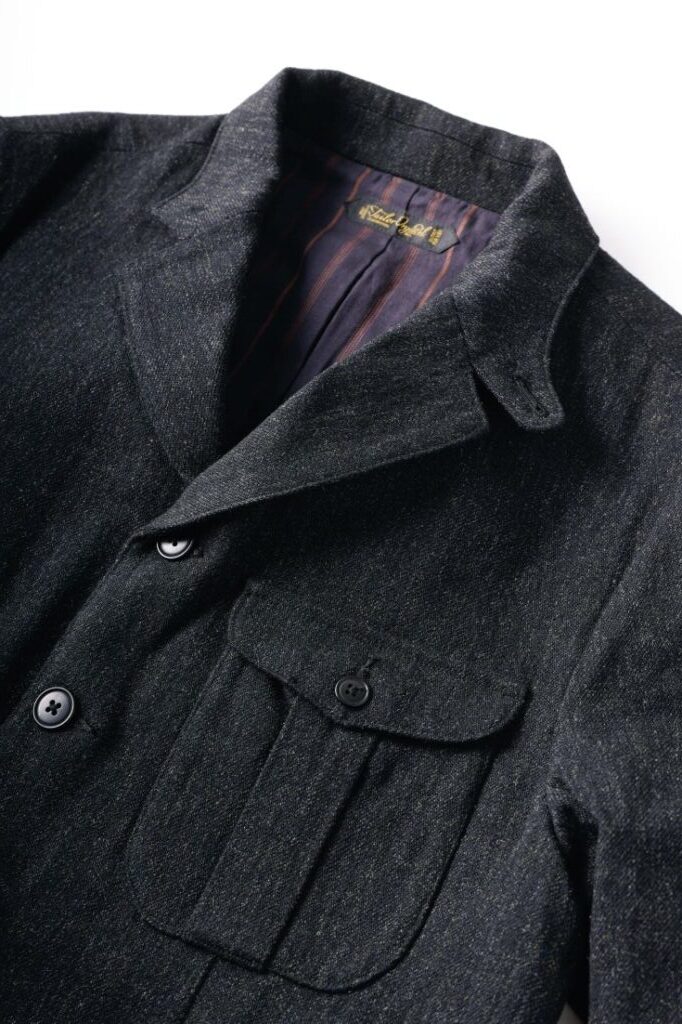 スリーボタンで狭めのVゾーンと幅の狭いラペルが特徴。モールスキンの生地は極厚で、防寒性も高めてくれる。