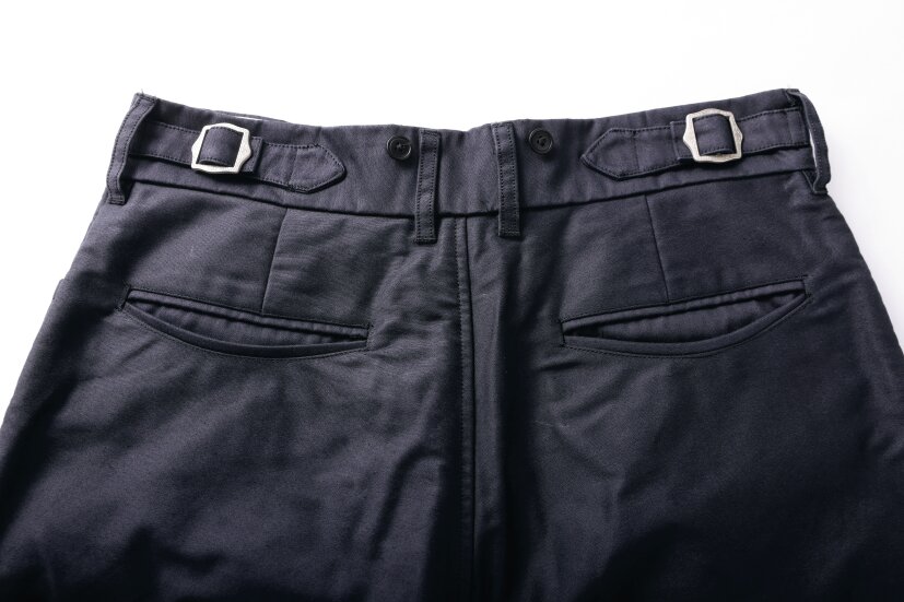 バックポケットもボタン留め。股上が深めでゆったりとし、動きやすいオーセンティックシルエット。