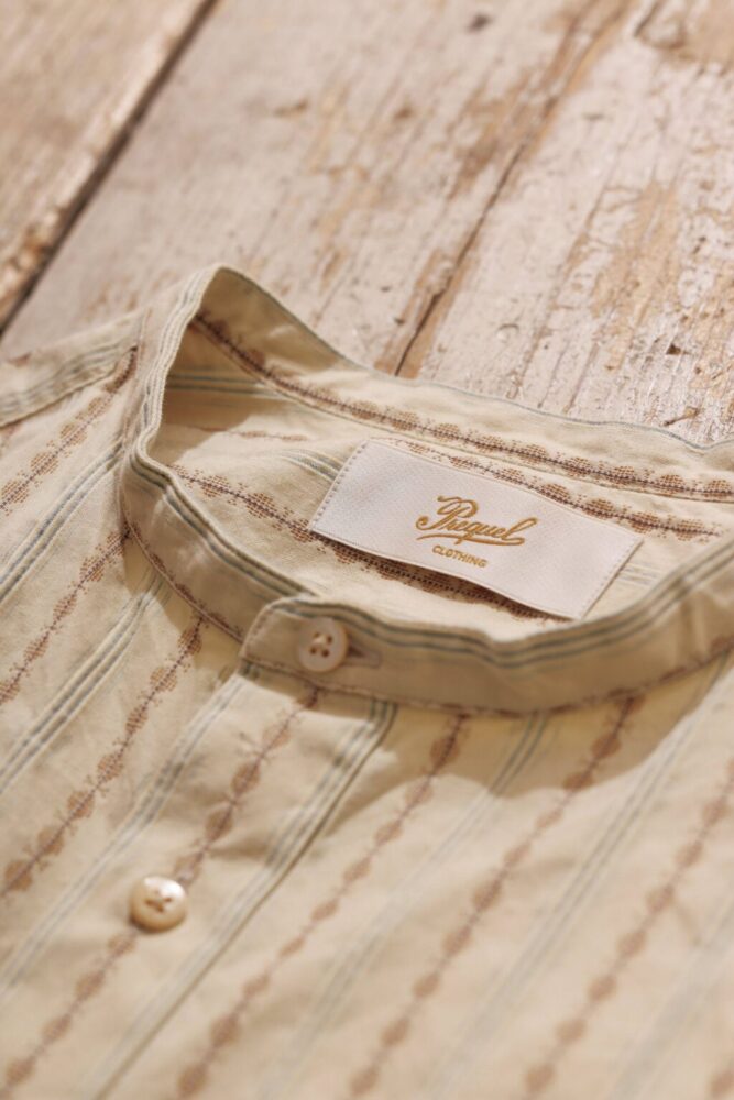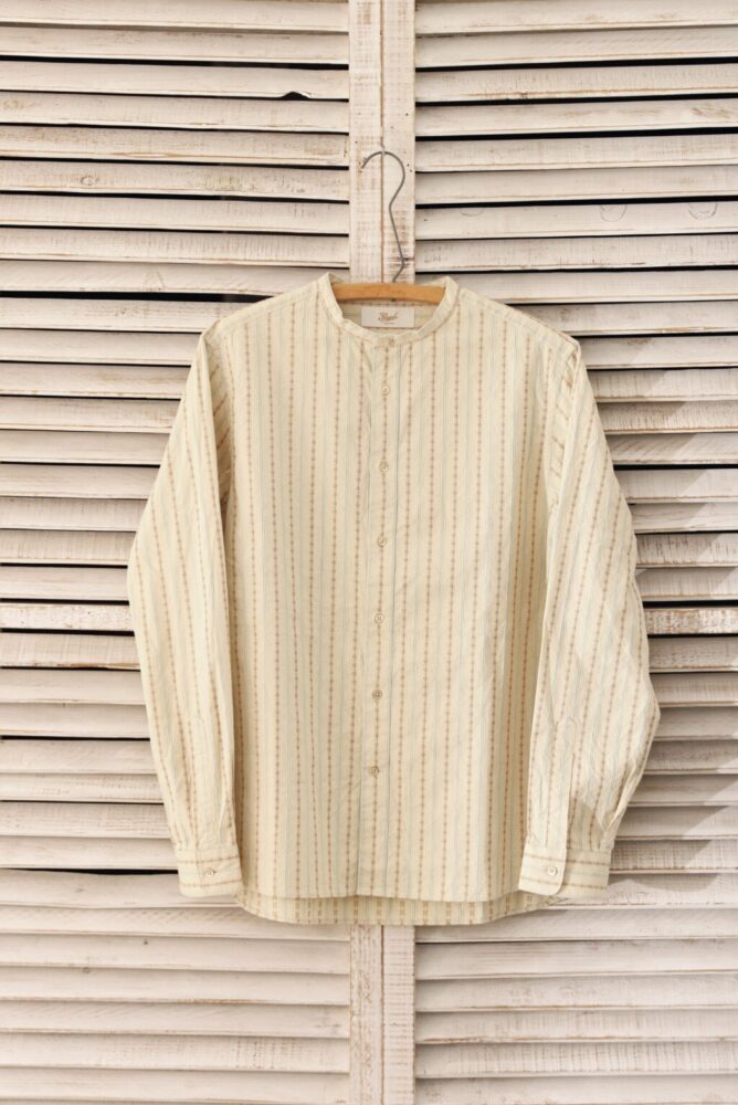 PREQUELが綴る第一章として誕生したスタンドカラーシャツ。新品でありながら、古いヨーロッパのデイリーウエアを見ているような錯覚に陥る。単なるデザインだけでは、こうはならないことを理解いただけるだろう。¥27,280_