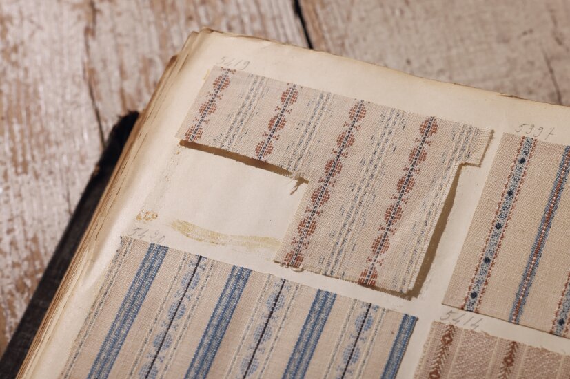 PREQUELが所蔵する100年前のフランスの生地サンプルが一冊にまとめられた見本帳。そこにはデザインが描かれているのではなく、生地の実物が無数に貼られている。眺めているだけでも当時の世の中を空想できる夢のようなシロモノ。