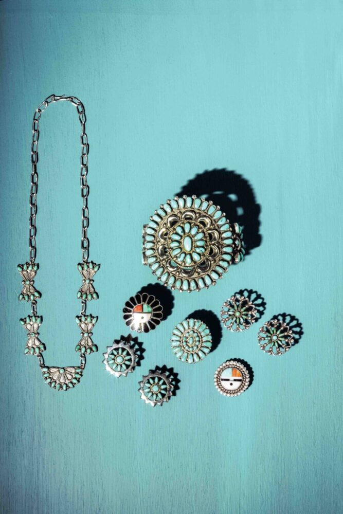 美しいブルーの石を用いたズニ族のヴィンテージジュエリー。チャンネルインレイという代表的な技法や石枠の細工など、限られた資源やモノを大事にする姿勢がジュエリーにも反映され、手で削り出された細かなターコイズを散りばめたクラスタージュエリーは手仕事の美を感じる。ネックレス¥198,000_、バングル¥297,000_、ピンズ、ピアス、リング各¥59,400_、イヤリング¥46,200_