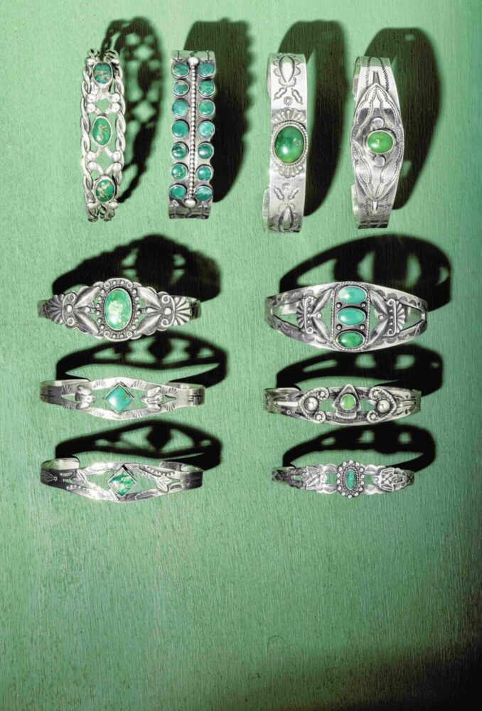 ターコイズは、大地を彷彿とさせるような碧もある。鉱山で言えば、キャリコレイクやロイストンあたりが代表格。存在感のあるグリーンターコイズにも負けないナバホ族特有の力強いスタンプワークが相乗効果を生んでいる。上段右から¥105,600_、¥145,200_、¥171,600_、¥99,000_、下段右上から¥89,100_、¥59,400_、¥59,400_、左上から¥82,500_、¥72,600_、¥59,400_
