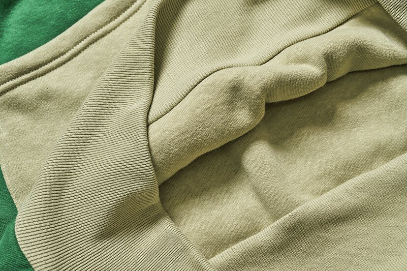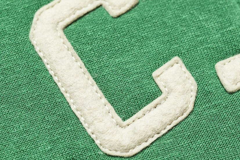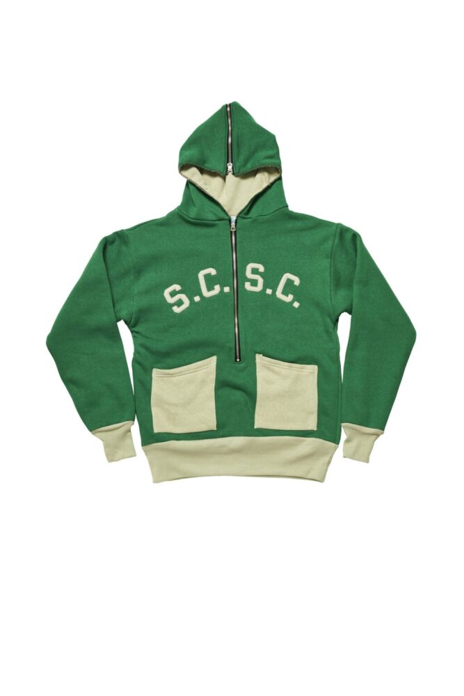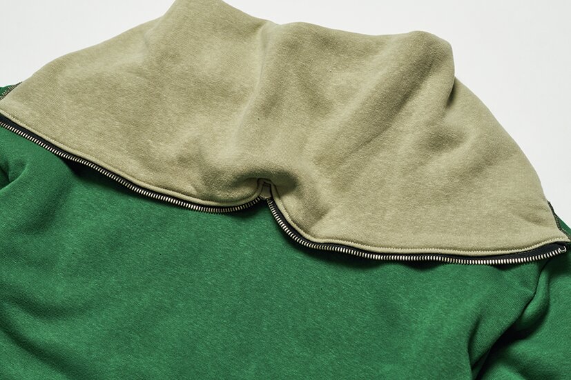 もとにしたヴィンテージを所有していたのがJohn Gluckow氏で、WAREHOUSEが手掛ける同氏のレーベルからリリース。ヴィンテージの中でも特にアスレチックウエアに精通した同氏をもってして、これ以上のパーカはないと言わしめた1着を完全再現。ジッパーも型から作り、フェルトのレタリングの有無、ヴィンテージと逆配色も入れた計4パターンをラインナップする。写真はPatchGreen / Beige