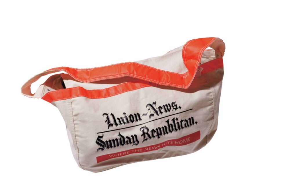 そんなに古いものではないが、デザインソースにはもってこいの、オレンジを挿したカラーリングが目に止まったニュースペーパーバッグ。バイク移動の時にも役に立ちそうだ。収納力もあって、みんながこの手のバッグを使っている理由がよくわかる。