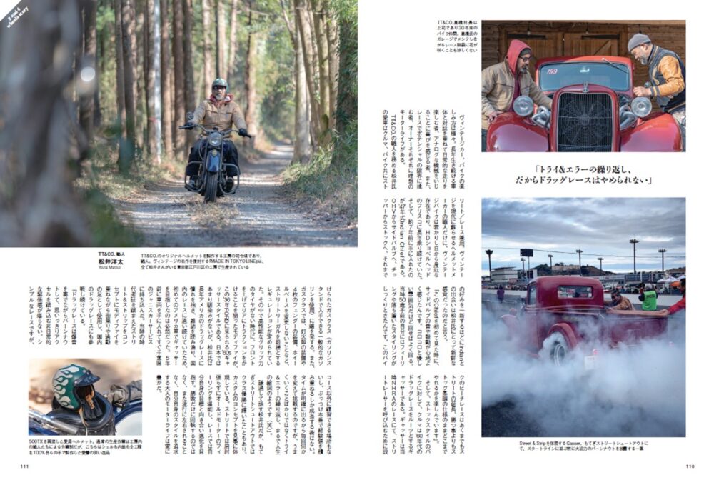 また、ヴィンテージライクなヘルメットに定評のあるTT&CO.の職人、松井さんの六輪生活を取材しました。バイクやクルマに対する熱意やこだわり、モーターライフの豊かさを語ってもらいました。ヴィンテージをはじめ、バイク、時計、ブーツなど、盛りだくさんのコンテンツをお楽しみください。
