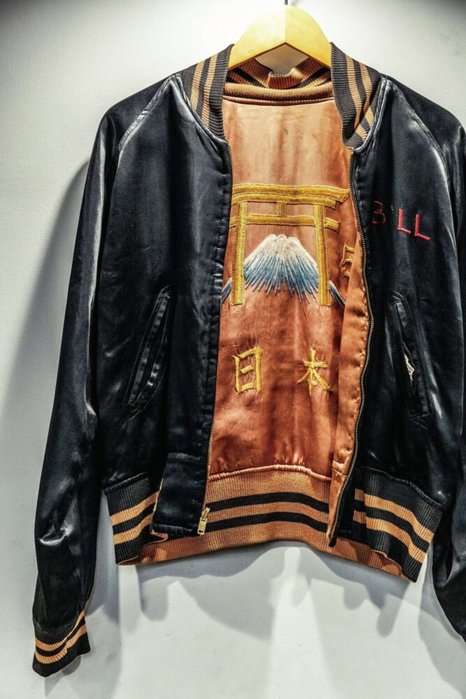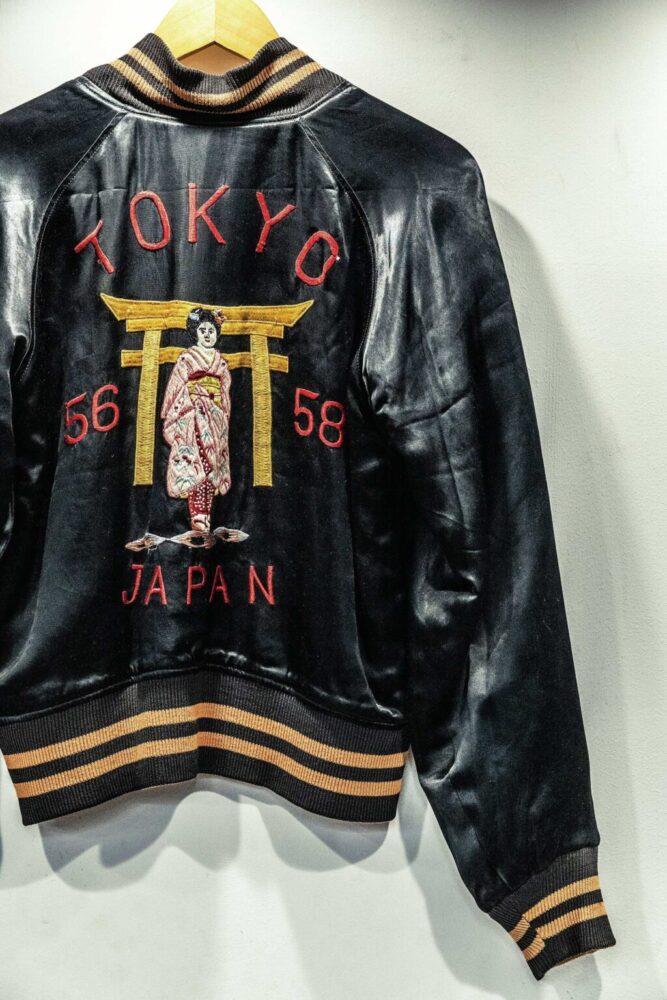 鳥居と舞妓、鳥居と富士山が背面に大きく鎮座する潔く力強いデザインのスーベニアジャケット。ブラックとブラウン、そしてゴールドとレッドの刺繍のバランスも美しいデザインは秀逸。刺繍には56-58とあるため年代は一目瞭然で美しい日本へのリスペクトすら感じさせる1着だ。¥385,000_