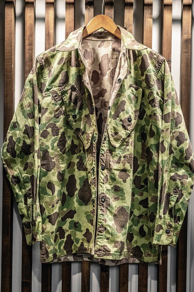 1940年代のパラマリンジャケット。フロントポケットの逆ハの字のポケットが印象的でヘリンボーンツイルのダックハンターカモ、ライニングもカモ柄がプリントされる。¥594,000_