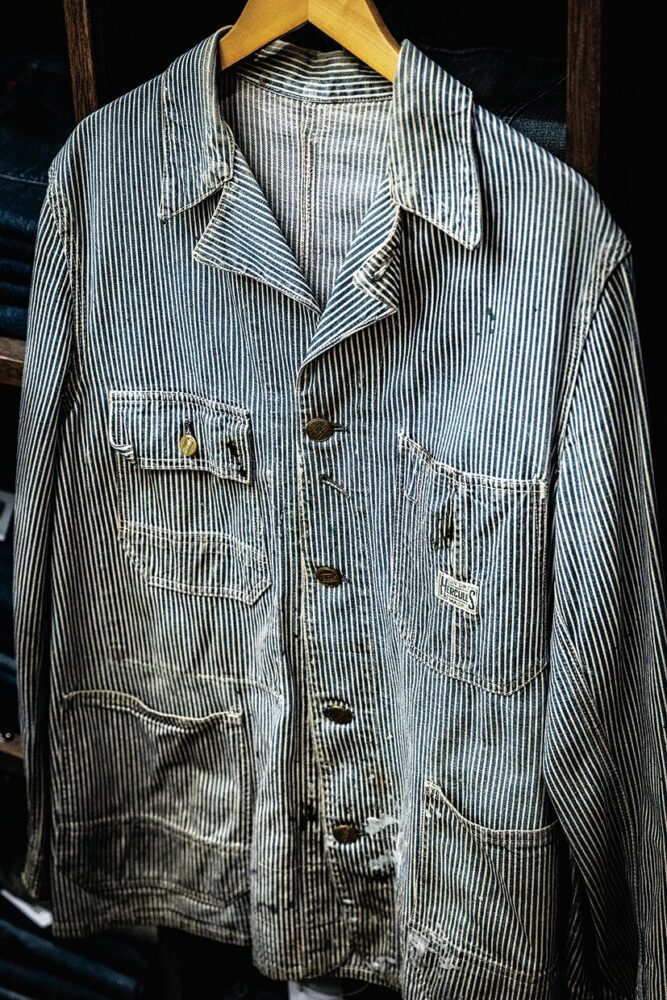 ヒッコリーストライプのカバーオールは1950年代のHERCULESのもの。フロントのペンキ跡やダメージなど、唯一無二はヴィンテージの風格を醸し出している。¥374,000_