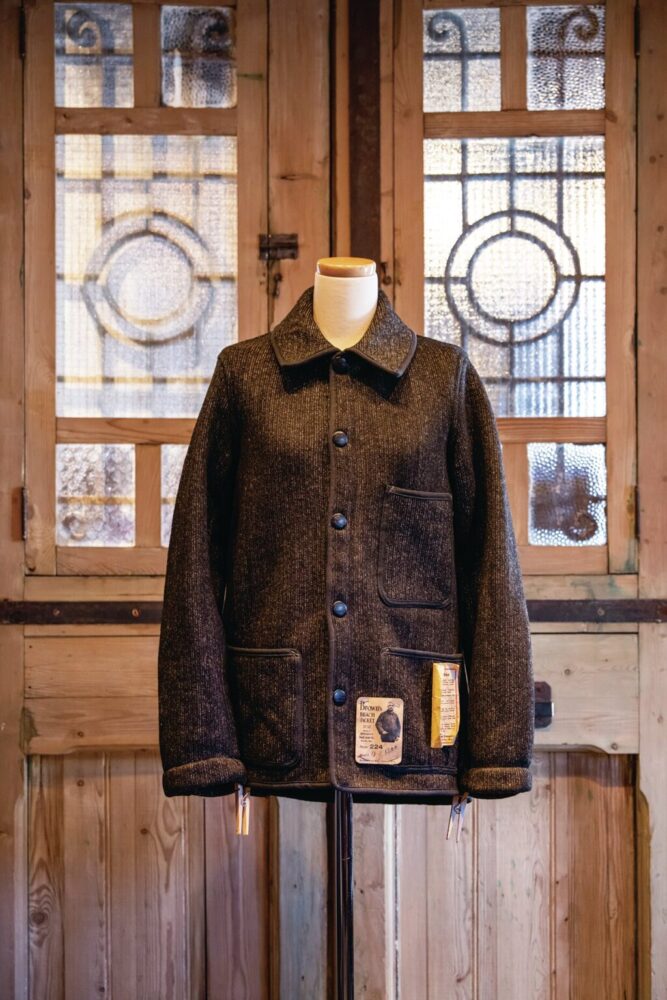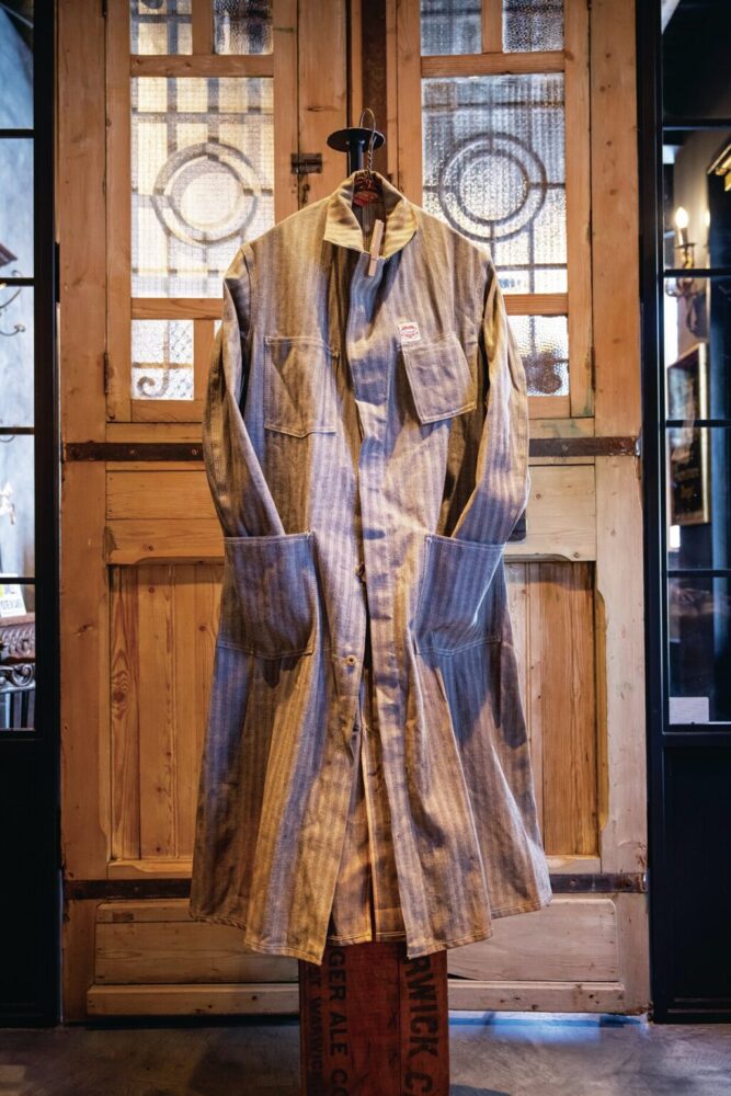 左胸にハートマークのタグが付けられているヘリンボーンツイルのショップコートは驚きのデッドストック。背面の接ぎにはセルビッジが使われる。¥1,416,800_